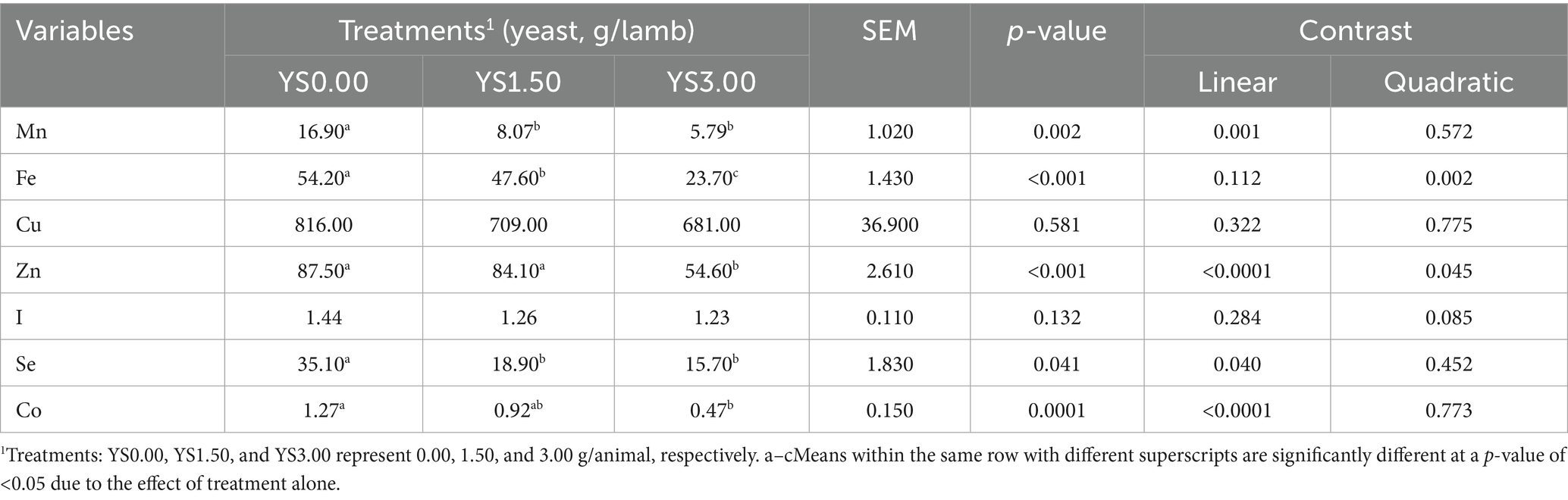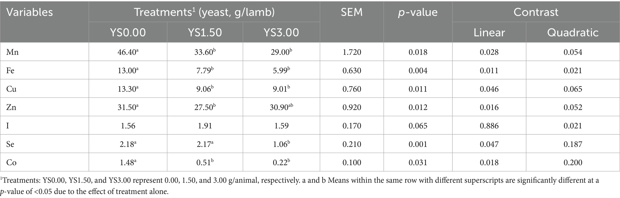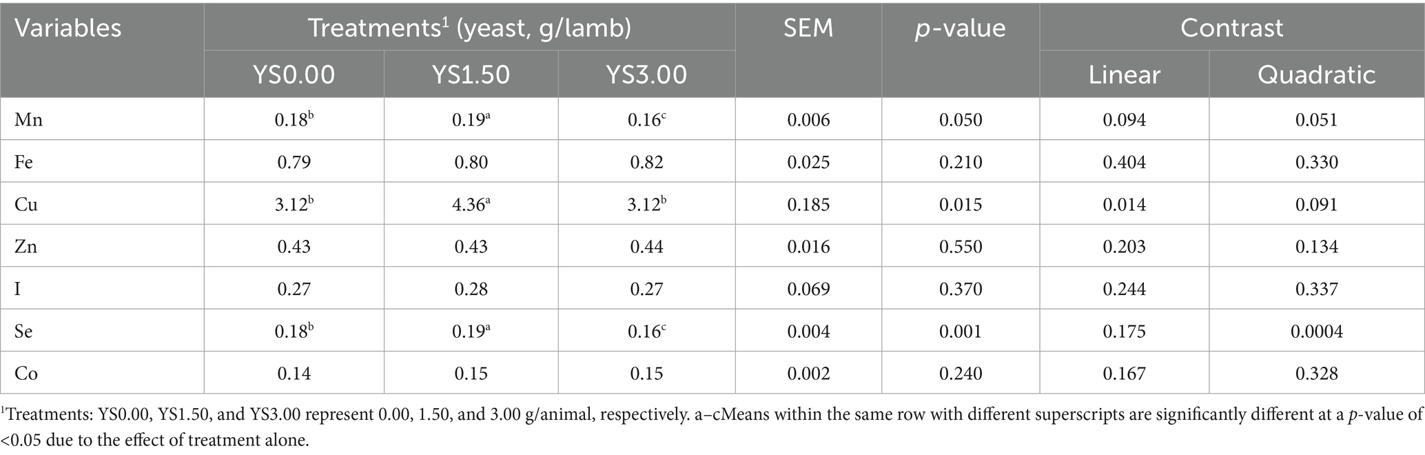 Results and discussion: In the YS3.00 group, yeast supplementation significantly increased overall roughage intake. However, it decreased feed efficiency, indicating that although animals consumed more, nutrient utilization efficiency was altered. The YS1.50 group showed significantly higher serum levels of Mn, Cu, and Se (p < 0.05). Rumen fluid TM concentrations were significantly affected by treatment, with lower values observed in the YS1.50 and YS3.00 groups compared to the YS0.00 group. A similar pattern was observed in meat, with the YS1.50 group showing significantly higher levels of most TMs, except for I and Cu. Strong positive correlations (p < 0.05) were found between rumen and meat TM concentrations for Mn, Fe, Se, and I, as well as between rumen fluid and serum for Fe and Cu. In conclusion, yeast supplementation at 1.50 g/day increased trace mineral concentrations in serum and meat, with the exception of I and Cu, and improved correlations between rumen fluid and meat for Mn, Fe, Se, and I, as well as between rumen fluid and serum, in the growing lambs.