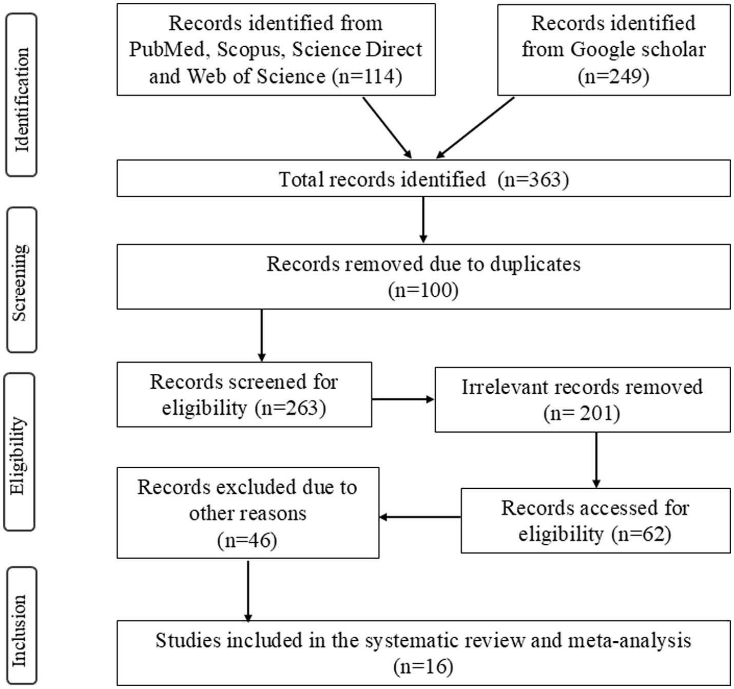 The systematic literature search across five databases (PubMed, Scopus, ScienceDirect, Web of Science, and Google Scholar) yielded 363 publications. After removing duplicates (n = 100), the remaining articles (n = 263) were screened based on titles and abstracts. Of these, 201 articles were excluded due to lack of relevance (e.g., clinical trials, randomized studies, or non-epidemiological studies) or duplicated data. A total of 62 full-text articles were assessed for eligibility, with 46 excluded due to insufficient prevalence data or lack of clarity with regards to the number of positively diagnosed dogs. Ultimately, 16 studies met the inclusion criteria and were assessed/evaluated in the systematic review and meta-analysis (Figure 1).