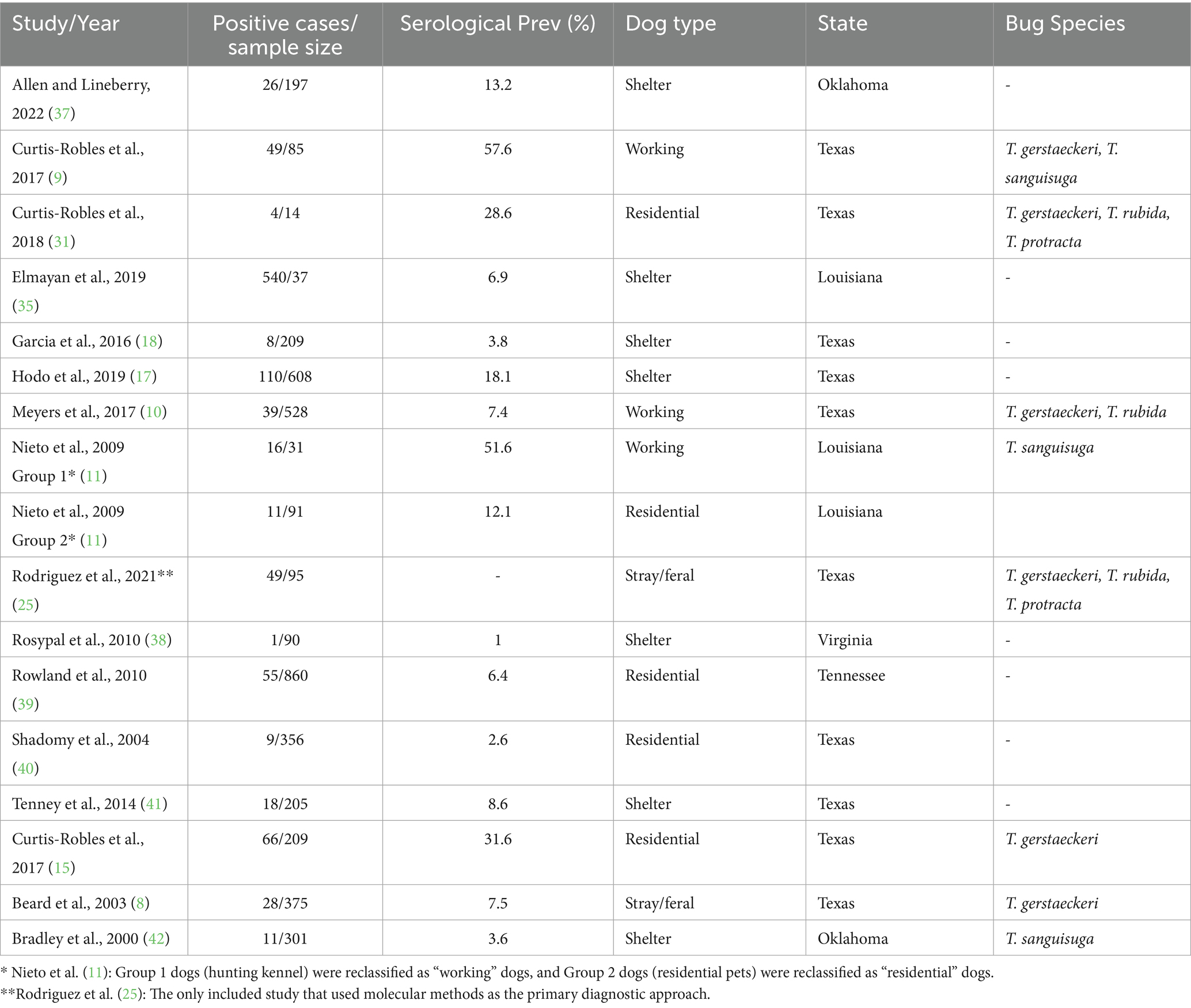 All studies included in the quantitative synthesis were cross-sectional investigations of T. cruzi infection in dogs conducted in the U.S. between 2000 and 2024, collectively sampling 4,974 dogs across five states (n = 5). Serological diagnostic techniques predominated, including enzyme-linked immunosorbent assay (ELISA), indirect fluorescent antibody test (IFAT), radioimmunoprecipitation assay (RIPA), and rapid immunochromatographic tests, while molecular methods (PCR) were employed less frequently. Nine (9) of the 16 studies reported triatomine species in or near study locations, most commonly Triatoma sanguisuga, T. gerstaeckeri, T. rubida, and T. protracta.