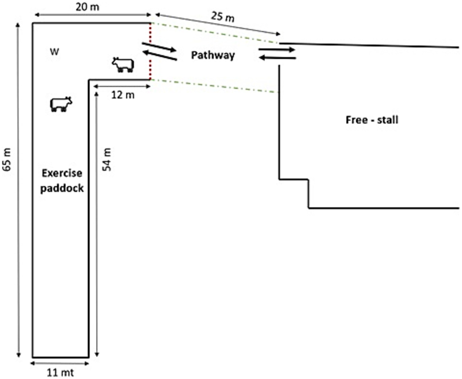 Dairy production intensification has increased the use of indoor housing systems. Indoor confinement provides a controlled environment for cattle and assures good milk production if a high-energy feed is given. However, this type of housing can lead to negative impacts for the animals’ health such as problems related to hock lesions, mastitis and lameness (1–3). This is why new approaches using mixed housing systems have been developing (4–6). However, the provision of pasture can be difficult, especially for large intensive farms, and depends on the availability of land from the farmers (7). Moreover, some literature has argued that the pasture access may decrease the productive performance of animals because the feed is less balanced than that provided in farm (8). One possibility is to use an external paddock, not for pasture but just as an exercise area for the animals to stay during some hours with the benefit that it can be used the whole year round (9). This approach may provide cows the same benefits as pasture because they would be able to freely stand, walk and lie down. Access to an outside paddock allows cattle to express normal behaviors and provides comfortable lying space. Natural behaviors such as social interaction and environmental exploration are enhanced by providing outdoor access (3). Moreover, this type of cattle management is considered an option that meets public concern over animal welfare (10, 11). Most studies present this outdoor access as a choice (5, 6, 12, 13) rather than as a forced system, and this may also impact welfare in a different way. In addition, even though this seems a good alternative for dairy cattle, some aspects such as the best time of the day and the duration of the exit are still unknown.