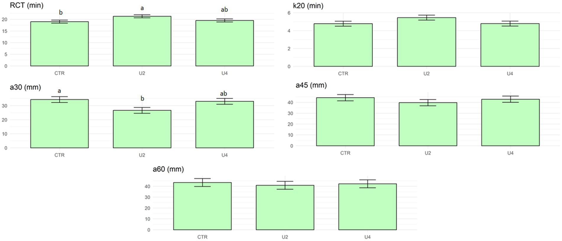 The daily outdoor access did not affect milk composition and cheese-making traits, as reported in Table 4. The effect of the day of analysis resulted highly significant for pH and RECprotein, and suggestively significant for the urea content and CYwater. As expected, the effect of the bath was not significant and the suggestive significance for the lactose could be due to the low variability of this trait. The coefficient of determination of the model varied from 0.39 for CYsolids and RECsolids to 0.90 for pH. On the contrary, the daily outdoor access suggestively (p < 0.1) affected two of the milk coagulation properties, RCT and a30 (Table 5). Milk from cows with a two-hour daily outdoor access (U2) had a longer RCT (21.31 min) and a lower a30 (26.66 mm) than the CTR group. Meanwhile, U4 showed intermediate values for these two parameters (Figure 2). Additionally, the effect of the cow was highly significant (p < 0.001) for RCT, k20 and a30. The effect of the day was significant (p < 0.01) for all the traits. The location of the sample inside the instrument affected (p < 0.05) only k20. The coefficient of determination was high for all traits, especially for RCT, k20 and a30, with values equal to or above 0.90.