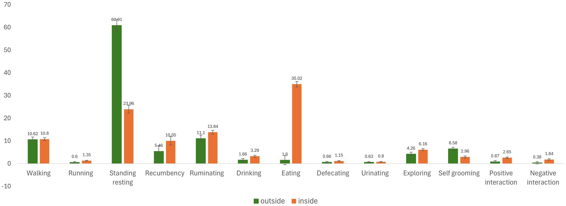 Figure 3. Least square means (min) of the setting (outside or inside) effect on behaviors in a 2-h timeslot. Black lines represent SE.