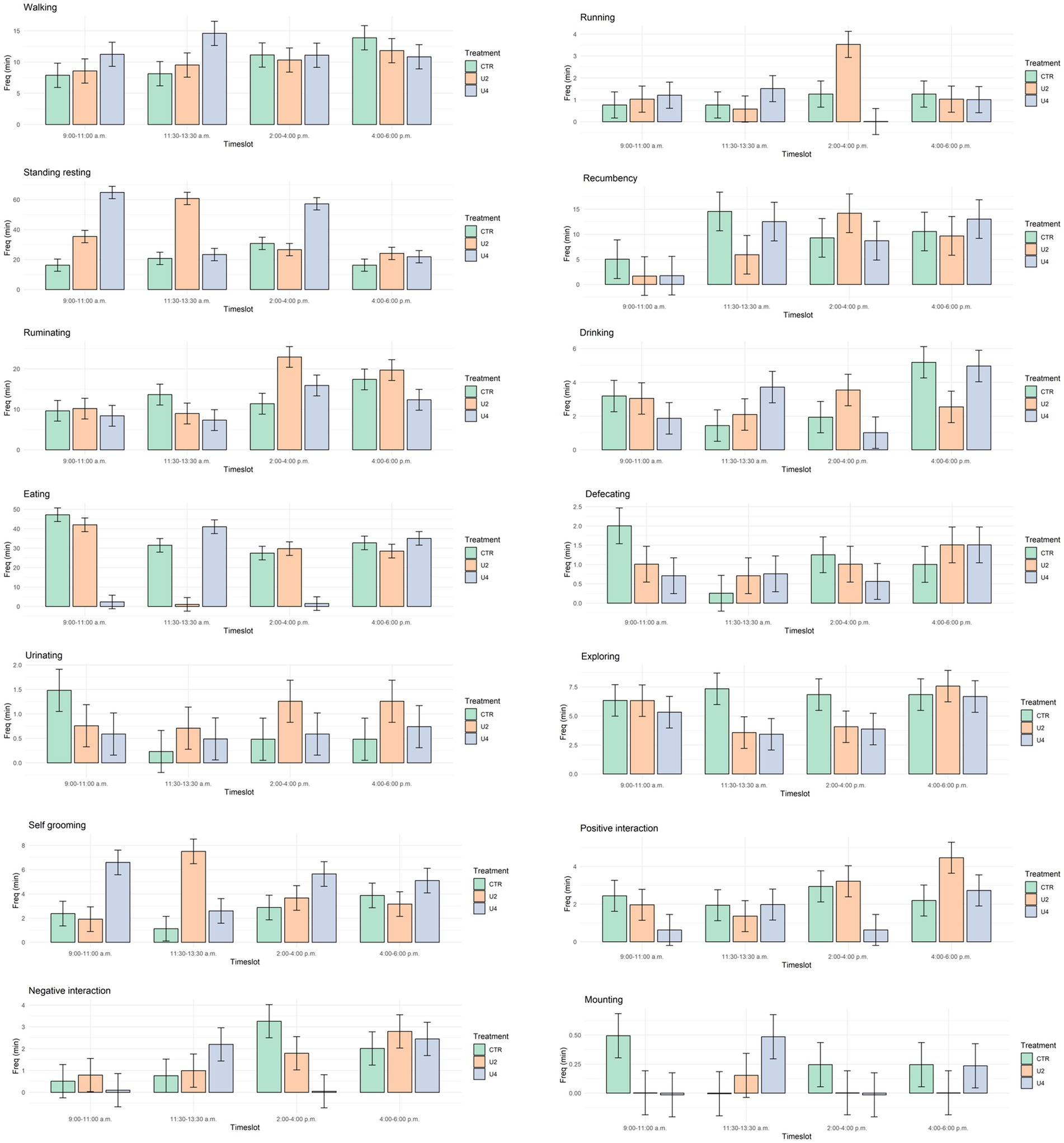 Figure 4. Least square means (min) of the behaviors considering the treatment effect within each timeslot. Black lines represent SE.