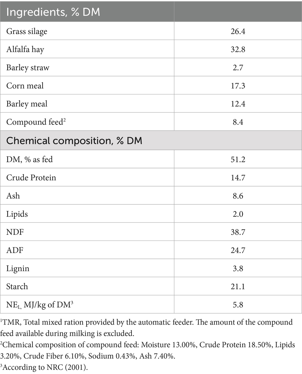 In accordance with the guidelines outlined by the National Research Council (NRC, 2001), all animals were fed a total mixed ration (TMR) based on grass-silage and alfalfa hay (Table 1) and maintained a forage:concentrate ratio of 62:38 to fulfill energy requirements for lactating dairy cows. The TMR was distributed twice a day, during the morning (8:30 a.m.) and the afternoon (5:30 p.m.). TMR samples were collected at the beginning and the end of the experiment, and then analyzed using near-infrared spectroscopy (NIRs) with a DS 2500 FOSS instrument (FOSS DS 2500, Foss Analytical, Hileroed, Denmark; spectral range 850–2,500 nm, reflectance mode). Additional compound feed was available, depending on daily milk yield, during the access to the automatic milking system of the farm. Fresh water was available ad libitum, both inside and outside.