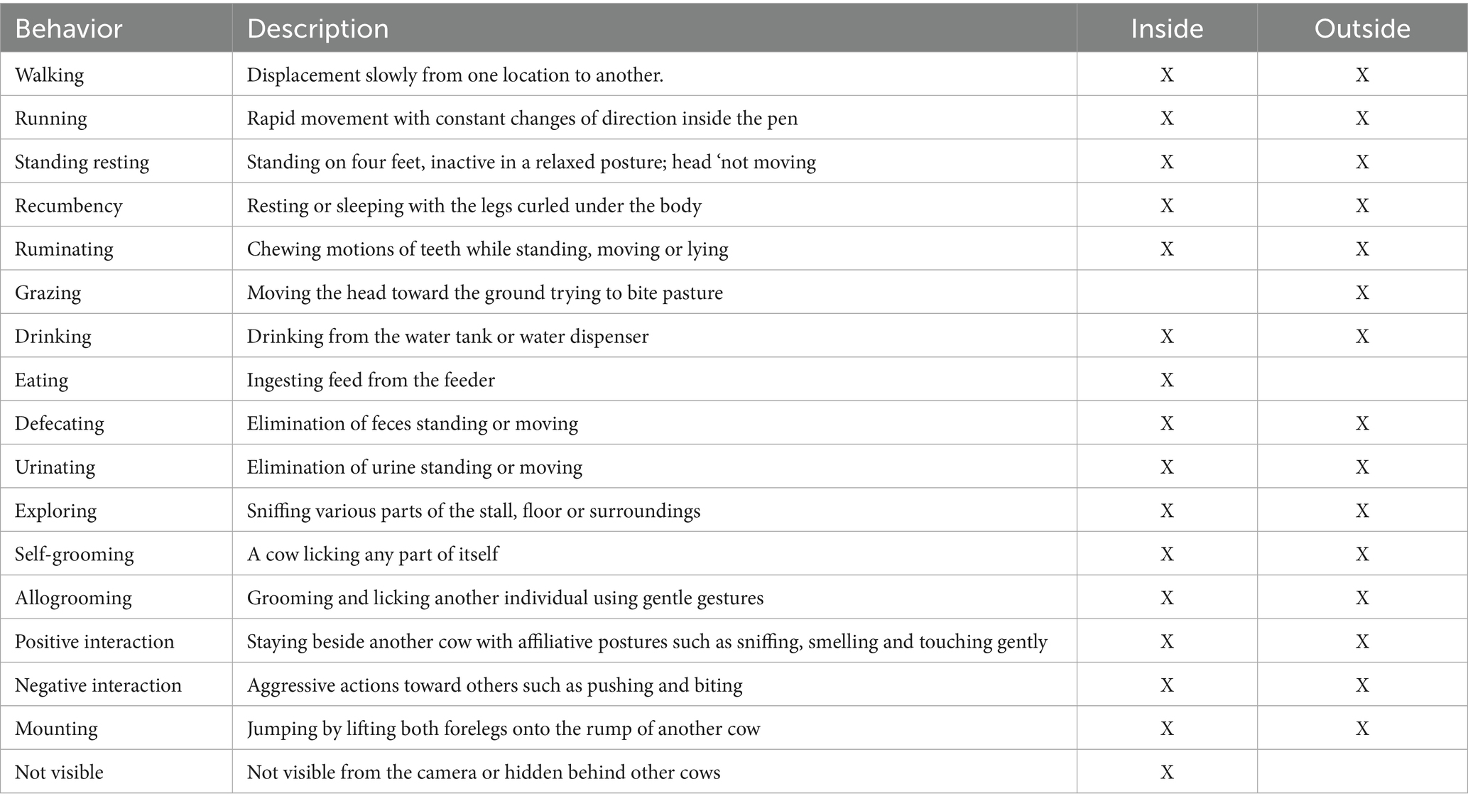 Before the experiment, all observers attended a 2-h training session conducted by a professor specialized in behavioral studies. Subsequently, they evaluated cows’ behavior both in real time (2 h) and from a video recording (2 h). Inter-observer reliability was assessed using the k coefficient (24), with all observers achieving a minimum k ≥ 0.7, indicating good agreement (25). The methodology for outdoor and indoor behavioral observations was different.