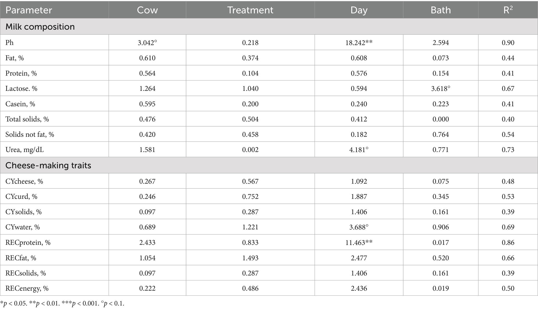 Milk samples were collected individually after the morning milking on the last day of each experimental period. All samples were transported, maintained at 4 °C and analyzed the day after at the Milk Laboratory of the Department of Agronomy, Food and Natural Resources, Animals and Environment – DAFNAE (University of Padova, Legnaro, Italy). Fat, lactose, protein, total solids, casein and urea content in milk were estimated using a MilkoScan FT6000 (Foss Electric A/S), following the procedures (18). Milk pH was measured using a Titralab AT1000 series with PHC805 (Hach Company, Loveland, Colorado, United States).