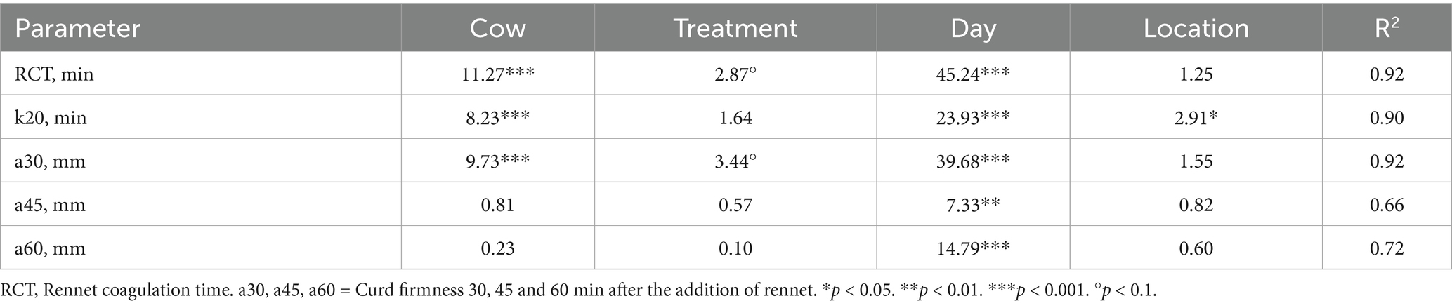 Milk coagulation properties of each individual milk sample were measured in duplicate, using two lactodynamographs (2 Formagraph instruments; Foss Electric A/S, Hillerod, Denmark). A calibration of the pendula was made before each trial session. The analysis followed the method described by (23), and the traditional parameters of milk coagulation properties were considered: rennet coagulation time (RCT, min) from rennet addition to gelation; time interval between gelation and reaching a 20 mm curd firmness (k20, min); curd firmness at 30, 45, and 60 min after rennet addition (a30, a45, and a60, mm).