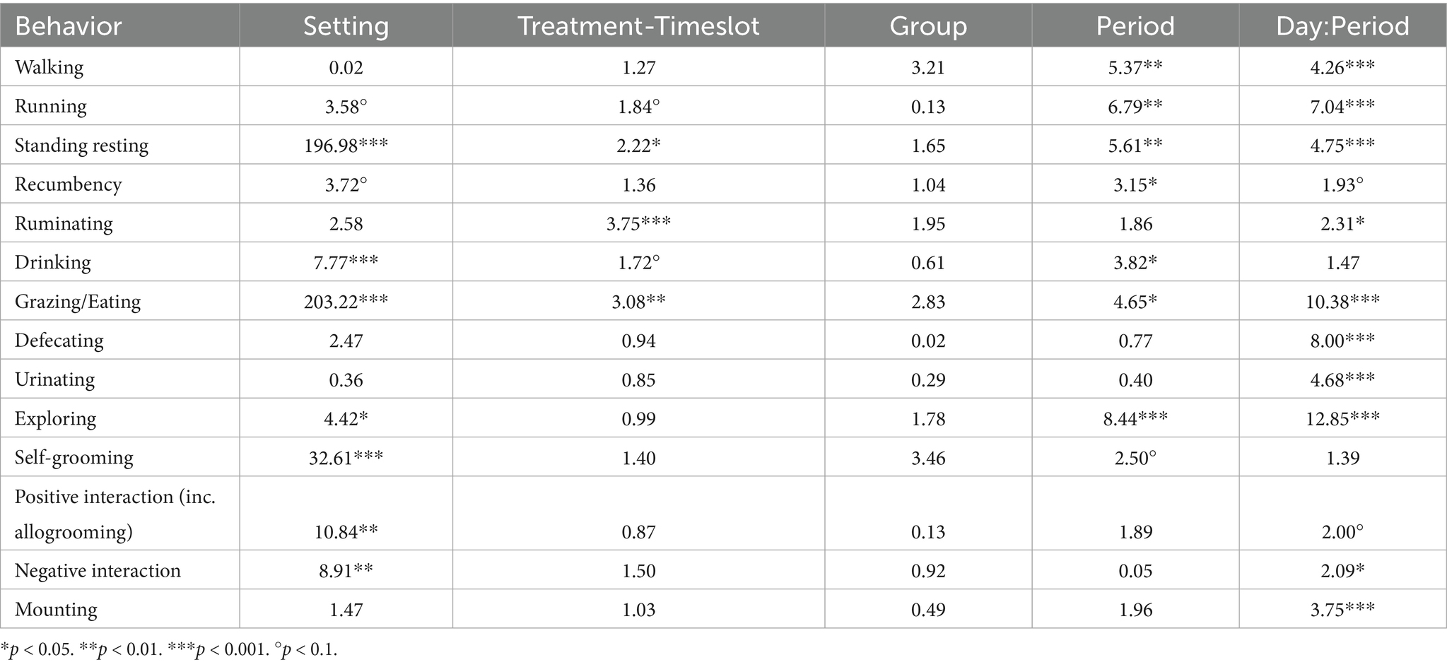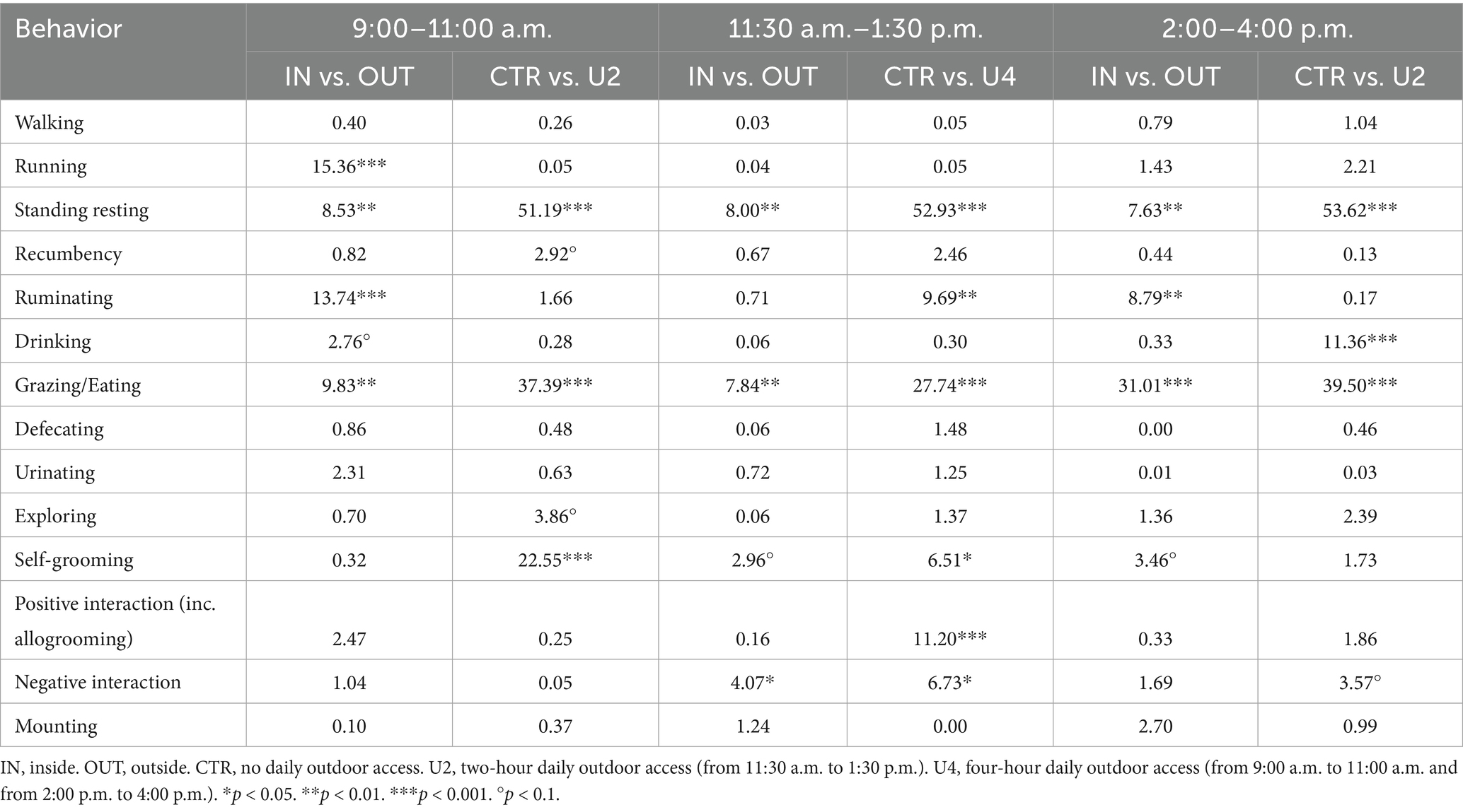 Recumbency behavior as time spent lying is a highly motivated behavior in cows. This trial found no differences between the timeslots evaluated throughout the day, which can confirm the fact that cows tend to maintain their lying time (14). This could be seen in the time spent on recumbency by the CTR group of cows throughout the day. On the contrary, the effect of the setting showed that recumbency time was higher inside than outside. In fact, it was seen in the literature that cows replaced their lying time spent indoors with activity time when they moved to an exercise paddock (31).