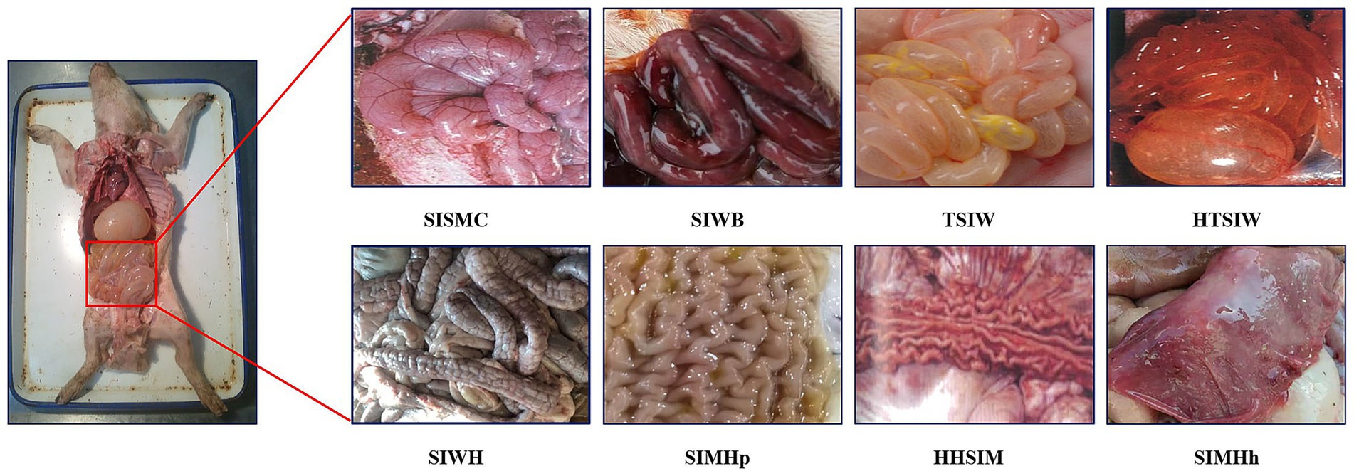 Figure 2. Lesion features in porcine small intestine. SISMC, the serosal layer shows dilated and engorged capillaries, appearing bright red with prominent texture; SIWB, Damaged mucosal capillaries cause blood to enter the intestinal lumen, with affected segments appearing dark red; TSIW, the intestinal wall becomes thin, even transparent, losing its original toughness and elasticity; HTSIW, the intestinal wall appears red, becomes thin and transparent, and loses its toughness; SIWH, the intestinal wall thickens, resembling a soft hose, with a rough or granular surface; SIMHp, the mucosal surface thickens, exhibiting longitudinal and transverse wrinkles with an uneven surface; HHSIM, the mucosa appears red or dark red, with thickened layers, a rough surface, and accompanying wrinkles; SIMHh, the mucosal surface shows bright red or dark red dotted, patchy, or diffuse hemorrhages.