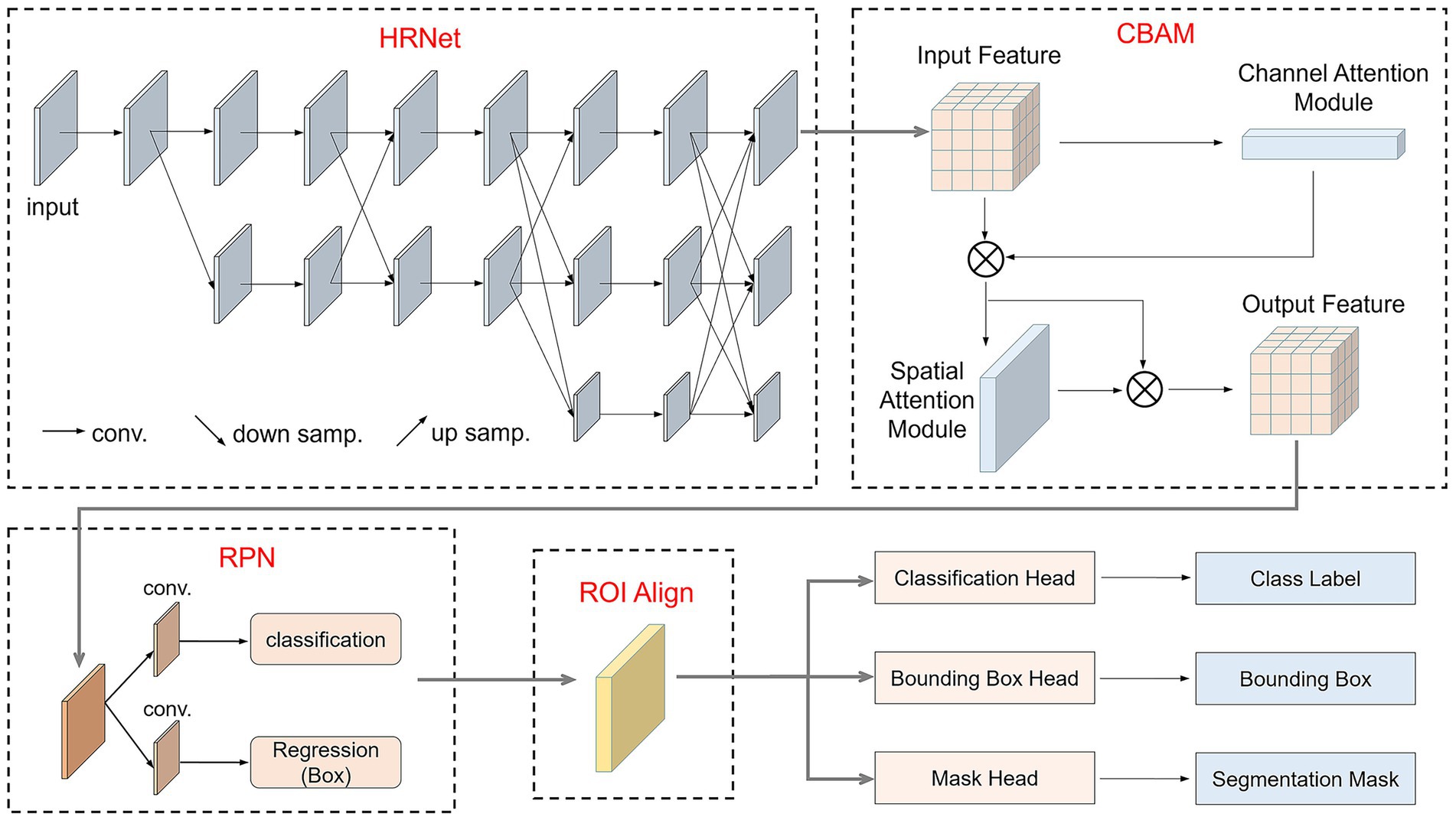 The improved model, as shown in Figure 4, replaces the original ResNet-FPN backbone with HRNet and incorporates CBAM modules in key output layers to enhance feature representation. After image input, HRNet first extracts multi-scale high-resolution features, which are then enhanced by the CBAM attention module in both channel and spatial dimensions. Subsequently, the Region Proposal Network (RPN) generates candidate bounding boxes on the feature map for preliminary target localization. The candidate regions are aligned using ROIAlign and fed into three branches: a fully connected layer for classification, a regression layer for bounding box regression, and a fully convolutional network (FCN) for mask prediction. The final output includes the category, bounding box, and corresponding pixel-level segmentation mask for each candidate region.