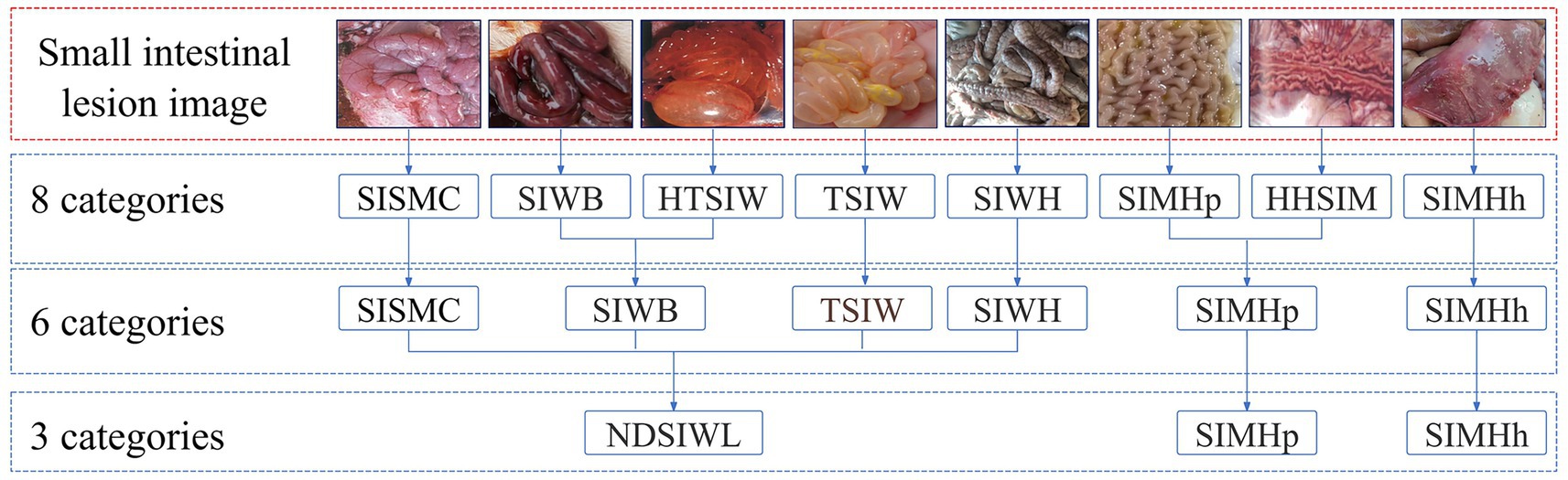 Each case included data in two different formats: a textual description of the swine’s disease onset information and anatomical images of the swine containing small intestine lesion regions. The textual description of the onset information covered details such as age at onset, season of onset, disease progression, clinical signs, appetite status, and fecal characteristics. The swine anatomical images included the lesion regions of the small intestine, with lesion characteristics primarily classified into 8 categories: small intestinal serous membrane congestion (SISMC), small intestinal wall bleeding (SIWB), hemorrhage and thinning of small intestinal wall (HTSIW), thinning of small intestinal wall (TSIW), small intestinal wall hyperplasia (SIWH), small intestinal mucosal hyperplasia (SIMHp), hemorrhage and hyperplasia of small intestinal mucosa (HHSIM), and small intestinal mucosal hemorrhage (SIMHh) (see Figure 2 for details).