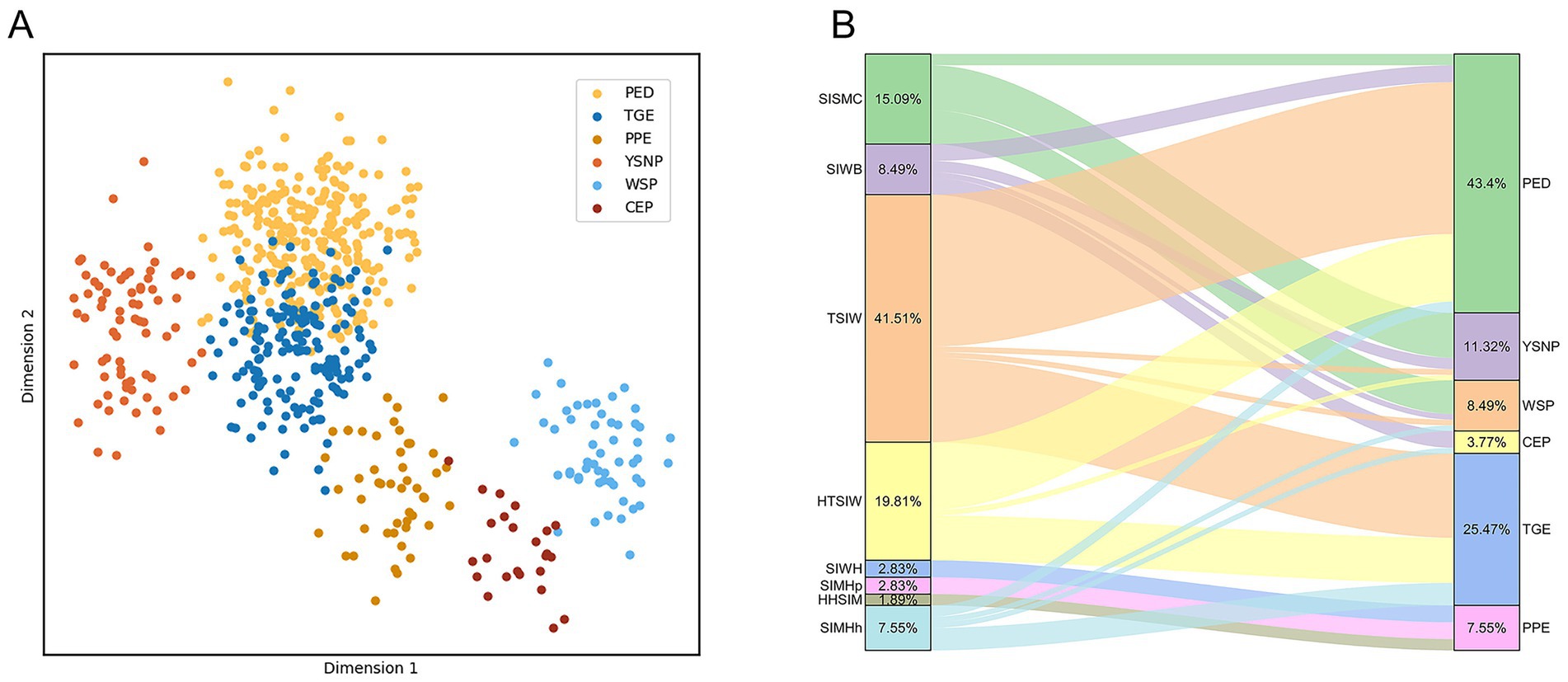 Figure 6. Visualization of single-modal classification effects. (A) Visualization of text classification effects. (B) Visualization of the mapping between small intestine lesion characteristics and porcine gastrointestinal infectious diseases.