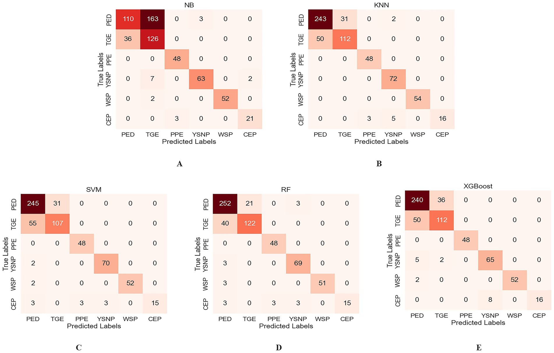 Figure 7. Confusion matrices of different machine learning models. (A) NB. (B) KNN. (C) SVM. (D) RF. (E) XGBoost.
