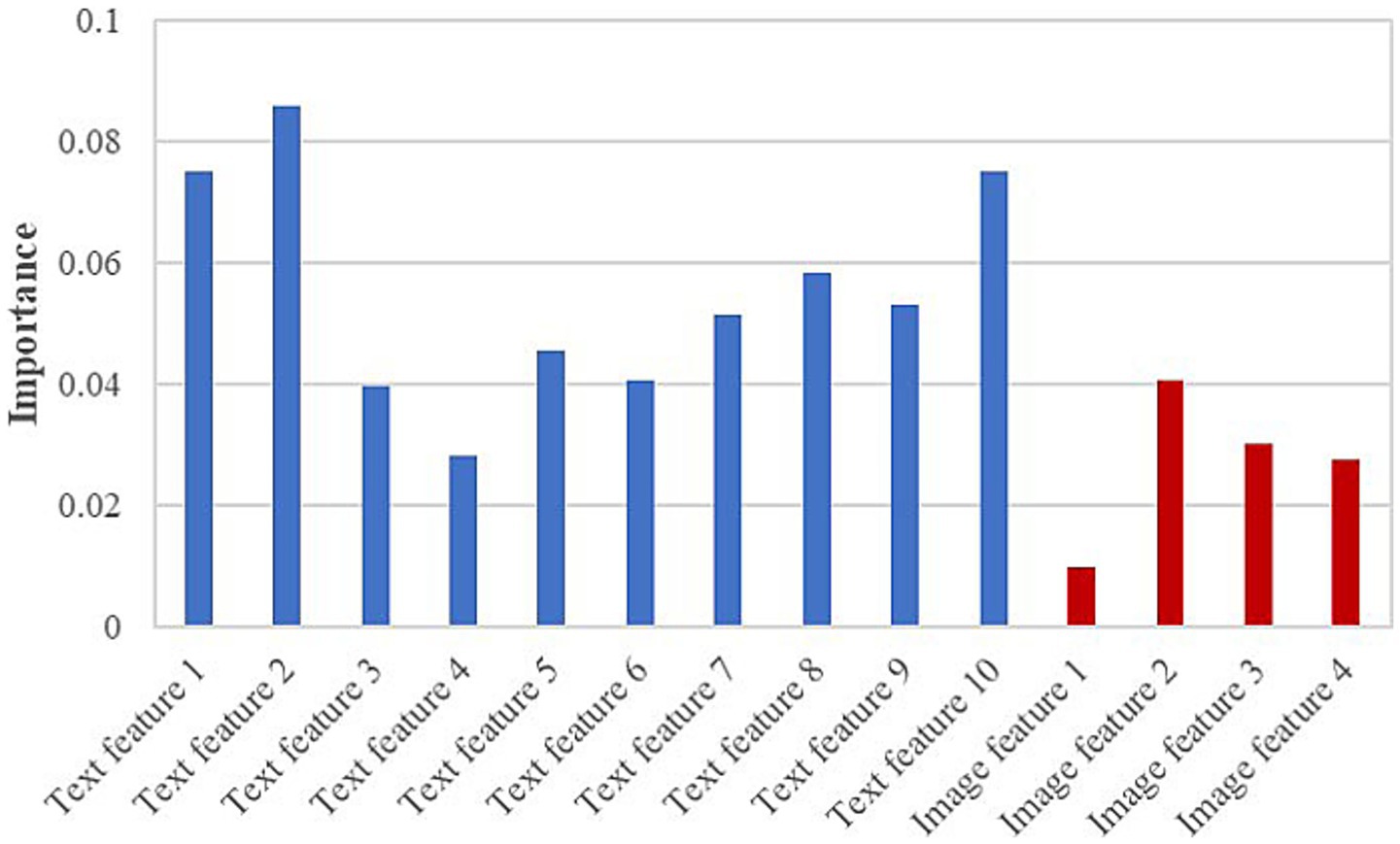 To further assess the contribution of each feature to the RF model, Figure 8 presents the importance scores of the text features and 8-class image features used in model construction. In the figure, blue bars denote text features and red bars denote image features. The results indicate that text features contribute more substantially to the model than image features. Further examination of the textual descriptions of PED and TGE revealed that some samples share highly similar keywords, which aligns with the partial overlap observed in Figure 6A. Moreover, as shown in Figure 6B, both diseases exhibit TSIW-type and HTSIW-type lesions in the anatomical images of the small intestine. These similarities in textual descriptions and lesion types collectively contribute to the difficulty in distinguishing certain PED and TGE cases.