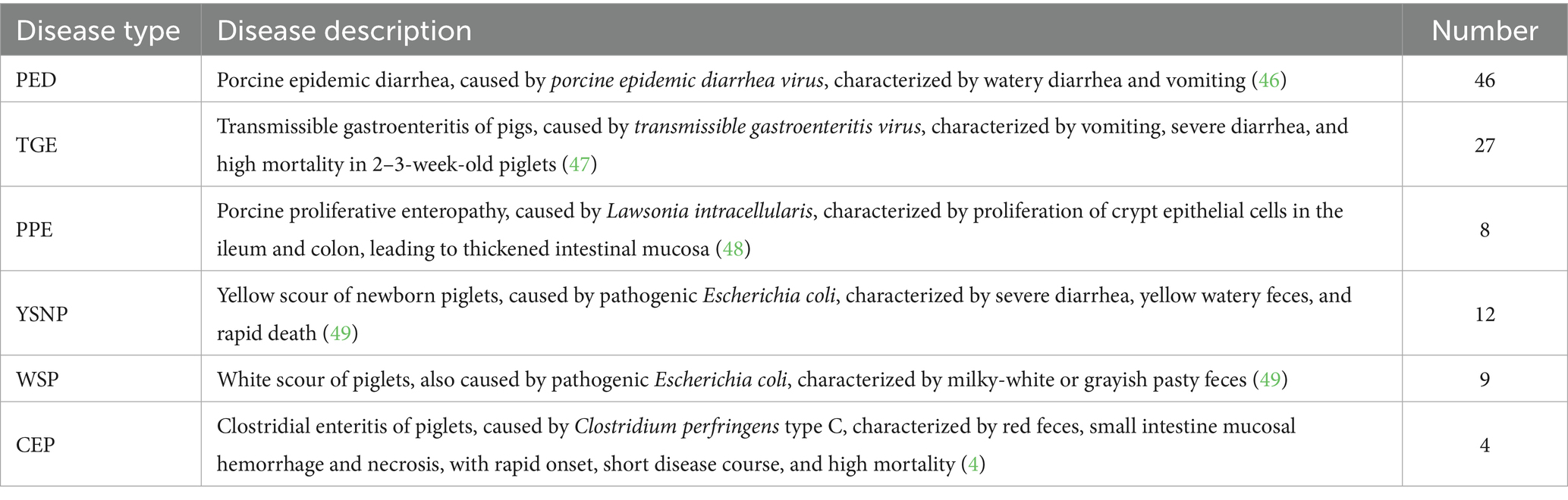 The swine disease data used in this study were sourced from the Animal Disease Research Institute of Heze University, collected from July to December 2023. The dataset comprised 106 confirmed cases of swine disease, covering 6 common types of PGID: porcine epidemic diarrhea (PED), transmissible gastroenteritis of pigs (TGE), porcine proliferative enteropathy (PPE), yellow scour of newborn piglets (YSNP), white scour of piglets (WSP), and clostridial enteritis of piglets (CEP). Details are provided in Table 1.