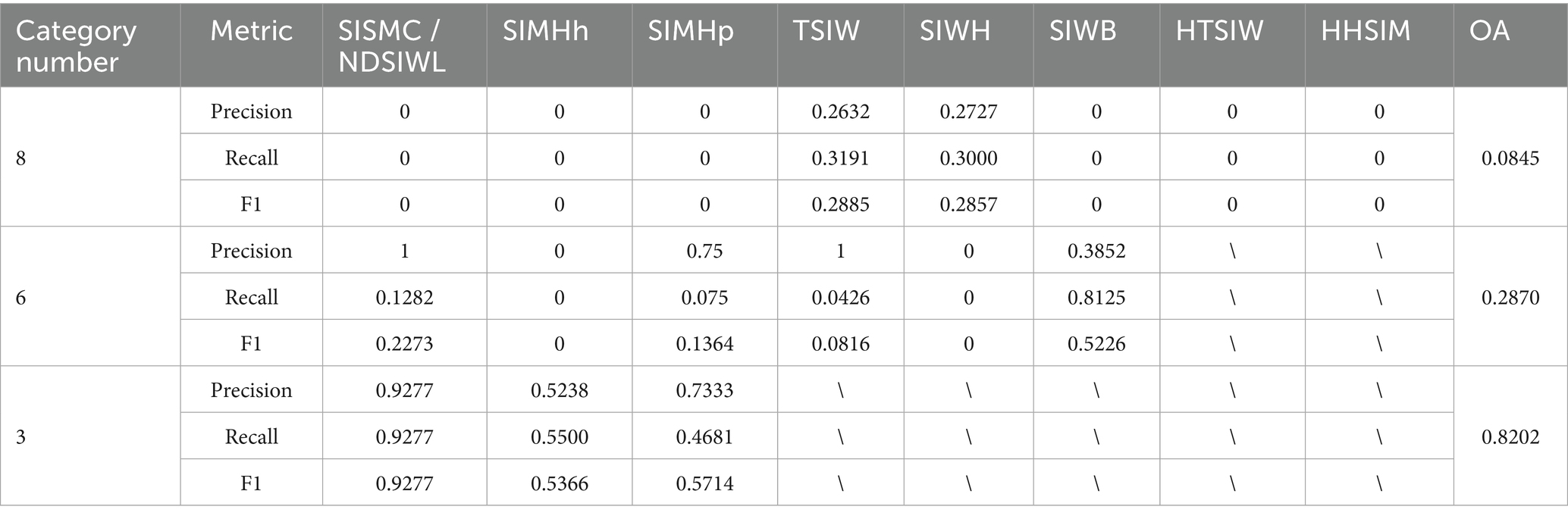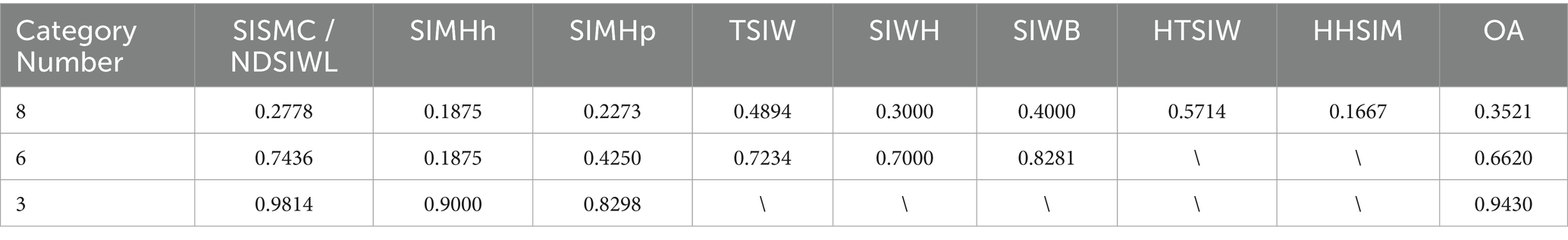 To further analyze the recognition performance of Mask R-CNN, Table 3 presents the detection rates under different classification methods to evaluate whether Mask R-CNN successfully detects lesion regions even when it fails to classify them correctly. The results show that in the 8-class scenario, the detection rates for all categories were low, with an overall detection rate of only 0.3521. In the 6-class scenario, the overall detection rate improved to 0.6620, with “SIWB” reaching a detection rate of 0.8281, and other categories also showing improved detection rates, indicating that merging similar categories enhances the ability to detect target regions. In the 3-class scenario, the detection rates for all categories significantly improved, particularly for “NDSIWL” and “SIMHh,” which achieved detection rates of 0.9814 and 0.9000, respectively. The overall detection rate increased to 0.9430, demonstrating that broader category merging significantly enhances the detection capability for lesion regions.