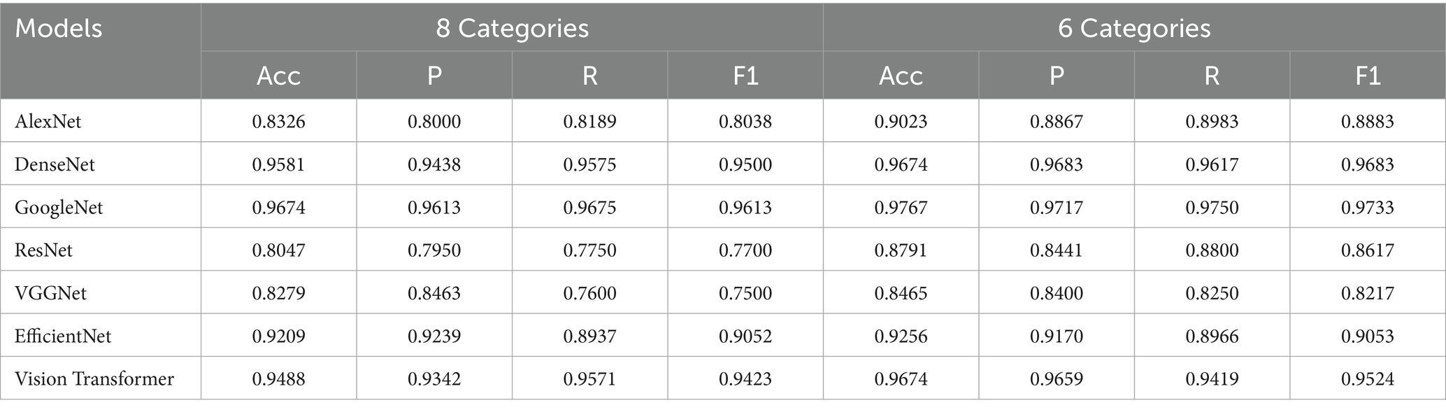 To investigate the impact of different classification granularities, the experiment was conducted with two approaches: 8-class and 6-class classifications, while the 3-classification method was solely used for image segmentation of lesion regions. Classic CNN models described in section 2.4 were trained and tested on the segmented images. The experimental results, as shown in Table 4, indicate that all CNN models achieved higher classification accuracy on the pixel-level segmented images, with the OA of the 6-class approach generally outperforming the 8-class approach. Although the 8-class approach can more finely characterize lesion features, it also increases classification difficulty, resulting in slightly lower accuracy. For example, GoogleNet achieved an accuracy of 96.74% in the 8-class scenario, which further improved to 97.67% in the 6-class scenario. Similarly, DenseNet’s accuracy increased from 95.81 to 96.74%, Vision Transformer’s accuracy increased from 94.88 to 96.74%. This suggests that for fine-grained lesion classification tasks, moderately merging similar categories can reduce the model’s learning difficulty, thereby achieving better classification performance.
