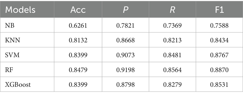 This study selected 5 classic machine learning classification algorithms for the final disease classification. Naive Bayes (NB), based on Bayes’ theorem, calculates class probabilities through feature independence assumptions, making it suitable for high-dimensional sparse data with advantages of efficient computation and ease of implementation (30). K-Nearest Neighbors (KNN) performs classification through majority voting based on sample distances, offering an intuitive and interpretable decision process, particularly suitable for small-scale datasets (31). Support Vector Machine (SVM) constructs a hyperplane by maximizing the classification margin, effectively handling high-dimensional and nonlinear problems, and performs exceptionally well with small sample datasets (32). Random Forest (RF) integrates multiple decision trees, enabling automatic feature selection and reducing overfitting, with strong robustness suitable for complex datasets (33). eXtreme Gradient Boosting (XGBoost) employs a gradient boosting framework with regularization and optimized feature splitting, significantly improving accuracy and efficiency in modeling large-scale datasets and nonlinear relationships (34).