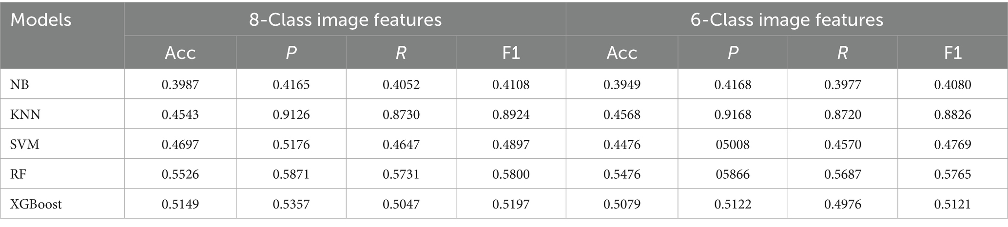 Then, the classifiers were applied to the image features (4 dimensions) extracted by Mask R-CNN + CNN under both 8-class and 6-class encodings, and the performance of all classifiers declined considerably, as shown in Table 6. The best results again came from RF, which achieved the highest accuracy 0.5526 for 8-class and 0.5476 for 6-class, with F1 scores around 0.58. At the other extreme, NB remained the weakest, with accuracies of 0.3987 for 8-class and 0.3949 for 6-class, and F1 scores near 0.41. The other models exhibited intermediate performance between the best and worst results, revealing certain limitations relative to the RF model. Overall, the results confirm that compared with text features, image features alone are less discriminative and less reliable for PGID classification.
