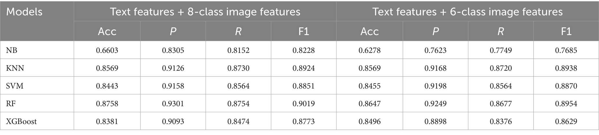 To further improve the recognition performance, this study performed feature-level fusion, combining the text features from MS-TextCNN with the image features from Mask R-CNN + CNN under both 8-class and 6-class encodings. The results are shown in Table 7. Among them, RF achieved the best performance, with accuracies of 87.58% (text + 8-class image features) and 86.47% (text + 6-class image features), outperforming all single-modality baselines. KNN, SVM, and XGBoost also demonstrated high overall accuracies (all >83%), validating the robustness of multimodal fusion, while NB remained the weakest (66.03 and 62.78%). Additionally, most models performed slightly better with the text + 8-class scheme, suggesting that finer-grained image encoding provides richer complementary cues to bagging classification.