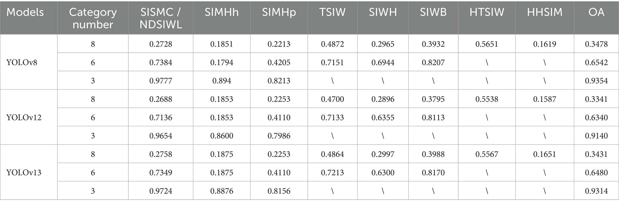 YOLO uses attention mechanisms and dynamic convolution to especially improve small object detection, achieving better detection accuracy and computational efficiency (38). To further validate the advantage of the proposed Mask R-CNN in improving the recognition accuracy of CNN networks, YOLO was used to detect swine anatomical images, with results shown in Table 8. It can be observed that under three different classification scenarios, the recognition performance of YOLOv8 is similar to that of the proposed Mask R-CNN model but slightly inferior. YOLOv8 (39) demonstrates slightly better recognition performance than YOLOv12 (40) and YOLOv13 (41), making it the most effective YOLO model under the data conditions of this study.