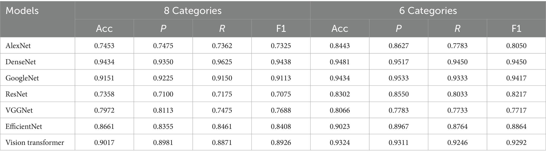 This study selected 7 classic CNN classification models for classifying segmented images. Alex Krizhevsky’s Convolutional Neural Network (AlexNet) employs large convolutional kernels and overlapping pooling layers, combined with ReLU activation and Dropout techniques, to effectively enhance image feature extraction capabilities, achieving groundbreaking results in the 2012 ImageNet challenge (23). Visual Geometry Group Network (VGGNet) progressively deepens the network using multiple 3 × 3 convolutional layers and pooling layers, capturing rich features from low to high levels, and demonstrates outstanding performance in various image recognition tasks (24). GoogleNet utilizes Inception modules to apply convolutional kernels of different sizes in parallel, capturing multi-scale features, while replacing fully connected layers with global average pooling to reduce computational complexity and improve efficiency (25). Residual Network (ResNet) introduces residual learning and skip connections, enabling effective training of deep networks, addressing the vanishing gradient problem, and excelling in image recognition tasks (26). Dense Convolutional Network (DenseNet) employs dense connections, allowing each layer to receive feature maps from all preceding layers, significantly improving information flow, reducing the vanishing gradient issue, and enhancing model generalization and efficiency (27). EfficientNet is a convolutional neural network architecture that simultaneously balances the depth, width, and resolution of the network through composite coefficients, significantly reducing model parameters and computational complexity while achieving higher accuracy (28). Vision Transformer divides images into patches and models them using a pure Transformer encoder, excelling at capturing global features and demonstrating image recognition performance comparable to or even superior to CNNs when trained on a large scale (29).