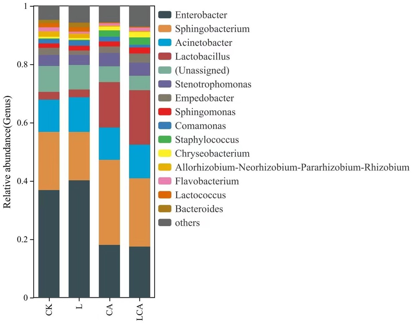 The relative abundance of bacterial species at the genus level in king grass silage under different treatments was shown in Figure 5. Enterobacter, Sphingobacterium, Acinetobacter, and Lactobacillus were the dominant genera in king grass silage across the different treatments. The relative abundance of Enterobacter in the CK, L, CA, and LCA groups were 36.92, 40.18, 18.13, and 17.44%, respectively. The relative abundance of Sphingobacterium in the CK, L, CA, and LCA groups were 19.85, 16.60, 29.09, and 23.51%, respectively. The relative abundance of Acinetobacter in the CK, L, CA, and LCA groups were 11.14, 11.96, 11.13, and 11.51%, respectively. The relative abundance of Lactobacillus in the CK, L, CA, and LCA groups were 2.66, 2.65, 15.53, and 18.65%, respectively. Compared to the CK group, the relative abundance of Enterobacter decreased in the CA and LCA groups, while that of Lactobacillus increased. In the L group, the relative abundance of Enterobacter increased, while Lactobacillus showed no significant change. This suggested that the addition of L. fermentum alone did not significantly increase the relative abundance of Lactobacillus in king grass silage, whereas the addition of citric acid alone or the combination of L. fermentum significantly increased its relative abundance. The main bacteria involved in silage fermentation were lactic acid bacteria. Comparative analysis revealed that the addition of lactic acid bacteria decreased the relative abundance of Sphingobacterium, while the addition of citric acid increased its relative abundance. Data comparison showed that the addition of L. fermentum, citric acid, or their combination in wilted king grass silage did not significantly alter the relative abundance of Acinetobacter. Additionally, Lactococcus was also detected in king grass silage.
