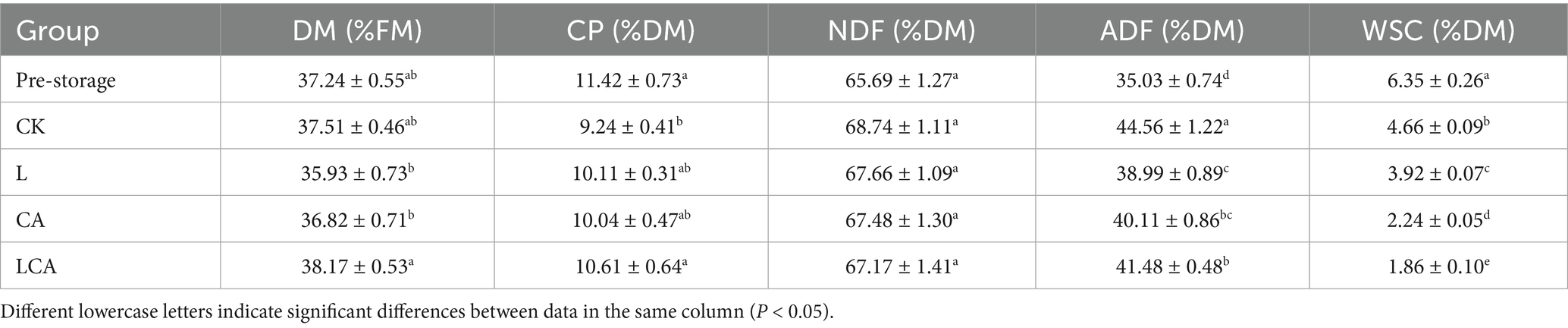 Aerobic stability is the ability of silage to resist spoilage from air exposure after fermentation is completed. Aerobic deterioration of silage feed can affect feeding effectiveness and, in severe cases, may damage the health of livestock and poultry. Aerobic deterioration is primarily caused by aerobic microorganisms, yeast, molds, and other microbes. Acetic acid can inhibit yeast growth, thereby alleviating aerobic spoilage of silage feed (33). In this study, the CA and LCA groups exhibited better aerobic stability, primarily due to their higher acetic acid content. After exposure to air, acetic acid inhibited the growth of some harmful microorganisms. The lactic acid bacteria added in this study were L. fermentum, which belongs to heterofermentative lactic acid bacteria. However, studies have shown that the addition of L. fermentum alone failed to improve the aerobic stability of silage. The possible reason for this phenomenon was that excessive wilting treatment resulted in excessively low moisture content, which not only inhibited the growth of undesirable microorganisms but also suppressed the growth and metabolism of L. fermentum.