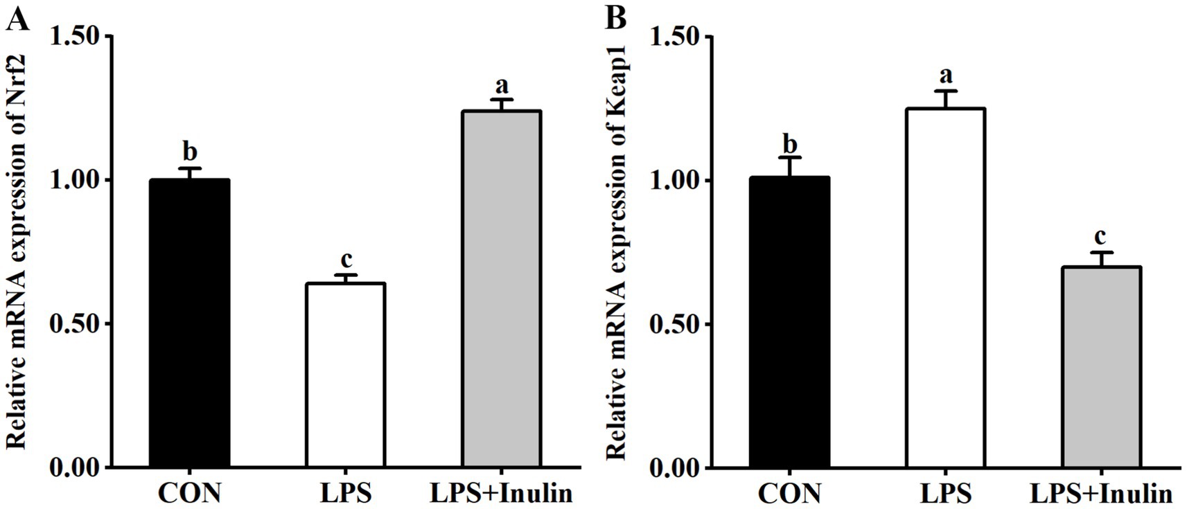 Figure 1. Effects of inulin on relative mRNA expression of Nrf2 (A) and HO-1 (B) in the liver of broilers challenged with LPS. CON, non-challenged broilers fed the basal diet; LPS, lipopolysaccharide-challenged broilers fed the basal diet; LPS + Inulin, lipopolysaccharide-challenged broilers fed the basal diet supplemented with 15 g/kg Inulin. Nrf2, nuclear factor erythroid-derived 2-related factor 2; Keap1, Kelch-like ECH-associated protein 1; Values are presented as mean ± standard error (n = 6). a-cMeans within the same row with different superscripts are significantly different (p < 0.05).