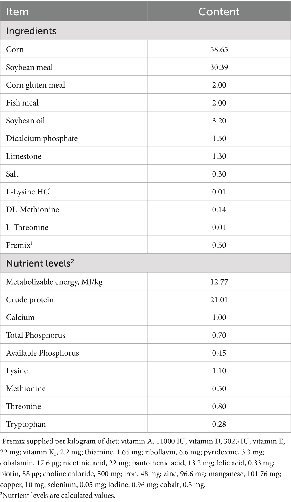 A total of 108 1-day-old male Arbor Acres broiler chickens were procured from a local commercial hatchery and reared in the poultry house of Poultry Institute, Shandong Academy of Agricultural Sciences (Jinan, China). Birds were raised in three-tiered cages in an environmentally controlled house. Each cage (90 × 60 × 40 cm) was equipped with a feeder and a nipple drinker to provide free access to feed and water. The temperature was maintained at 33 °C during the first week, followed by a gradual reduction of 3 °C per week until reaching 24 °C. Relative humidity was maintained at 60 to 70% for the first 3 days and thereafter maintained at 50 to 60%. The light regimen was 23 h of light and 1 h of dark throughout the experimental period.