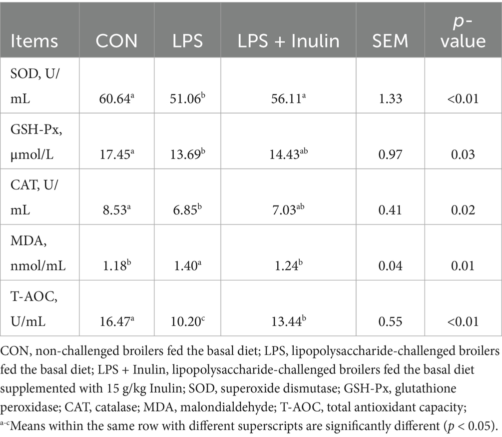 To date, few studies have focused on the effects of inulin on the antioxidant capacity of chickens under normal physiological conditions, and these studies indicate that inulin supplementation can enhance the chickens’ serum antioxidant capacity (12, 25). Similarly, our results also revealed that dietary inulin supplementation effectively prevented the LPS-induced reduction in serum SOD activity and the concomitant increase in serum MDA level. Although not significant, a marginal improvement was noted in serum GSH-Px and CAT activities by inulin supplementation. These ameliorations ultimately led to a significant increase in T-AOC in the LPS + Inulin group, though it remained lower than that of the CON group. These findings collectively suggest that inulin exerted protective effects against LPS-induced systemic oxidative stress in broilers.