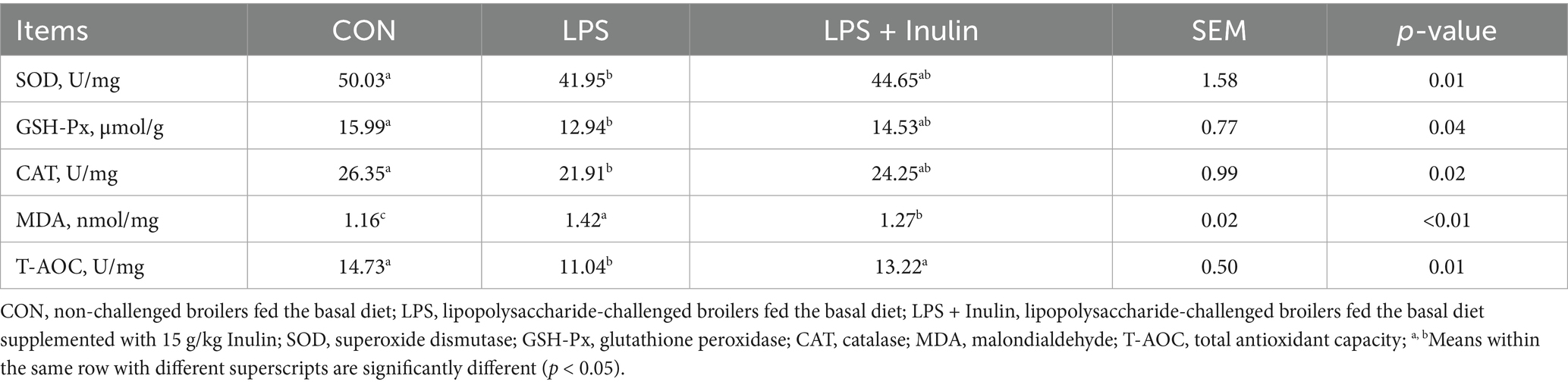 Discussion: Collectively, these findings indicate that inulin supplementation effectively alleviates LPS-induced oxidative stress, highlighting its potential as a feed additive in broiler diets to combat oxidative stress.