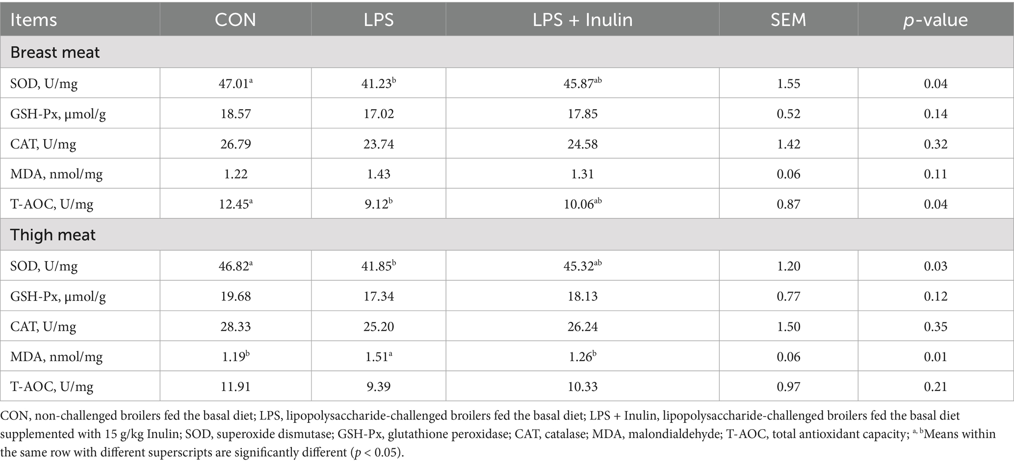 Lipid oxidation constitutes a primary determinant of quality deterioration in chicken meat, which negatively influences its functional, sensory and nutritive values (30). Consequently, the antioxidant capacity of meat plays a crucial role in mitigating lipid oxidation, thereby maintaining meat quality and extending shelf life. It has been well documented that the antioxidant capacity of meat is susceptible to impairment under various stress conditions (31, 32). Our results also showed that LPS challenge weakened meat antioxidant capacity, as evidenced by the reduced SOD activity in both breast and thigh meat, and the elevated MDA level in thigh meat. The ability of inulin to improve antioxidant capacity in chicken meat has been demonstrated in a previous study (33). Consistently, this study found that supplementation of inulin partially mitigated the detrimental effects of LPS on SOD activity and MDA level, restoring both parameters to the levels of the CON group. These findings once again validate the role of inulin in enhancing muscle antioxidant capacity. The enhanced muscle antioxidant capacity by inulin supplementation is beneficial for improving meat storage stability and prolong its shelf life.