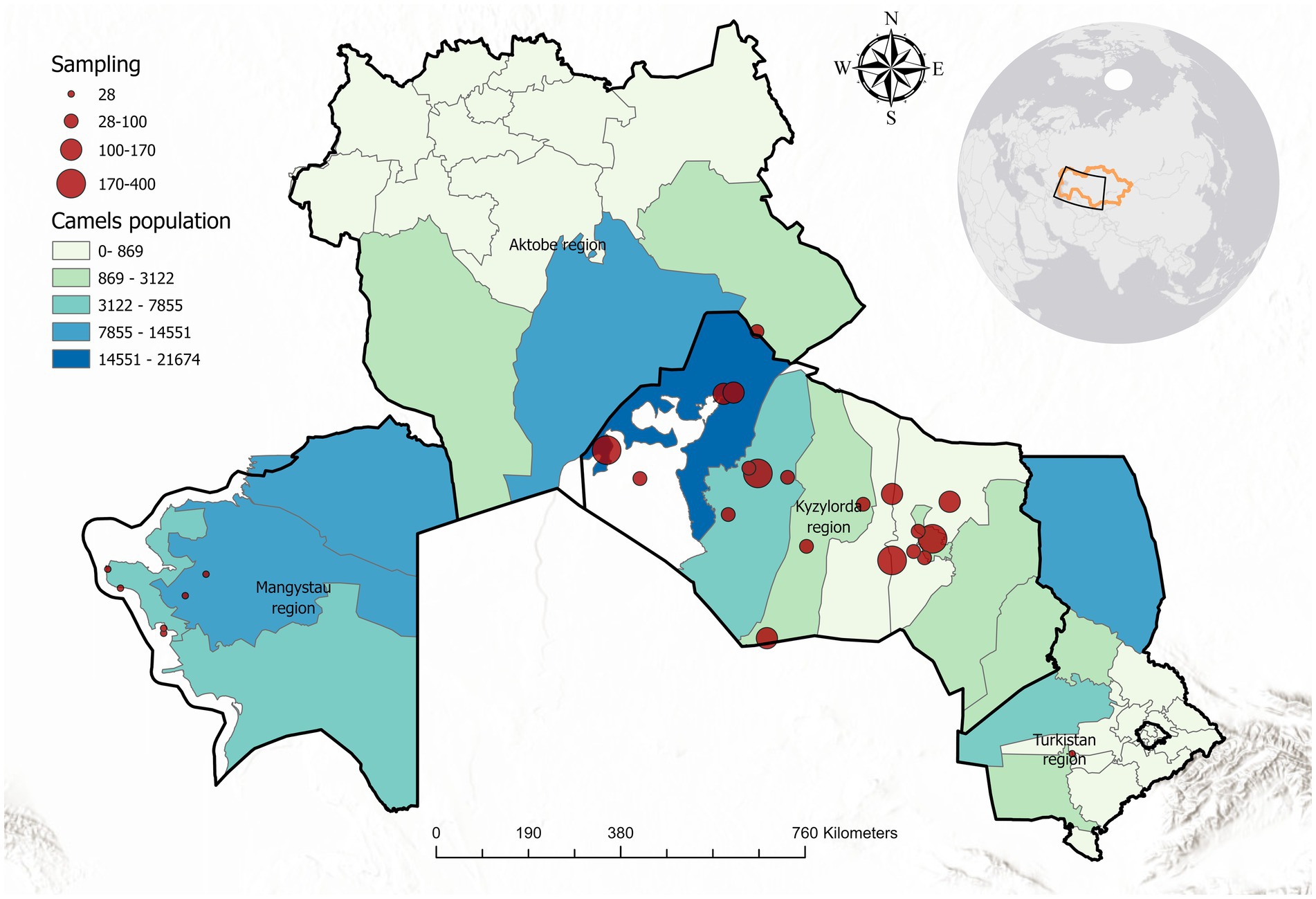 Map showing regions in Kazakhstan with varying camel populations, indicated by shades of green and blue. Darker shades represent higher populations. Red circles represent sampling locations, varying in size according to the number of samples. Regions labeled include Mangystau, Kyzylorda, and Turkistan. A compass rose and an inset map showing the location within Eurasia are included. Scale bar shows 760 kilometers.