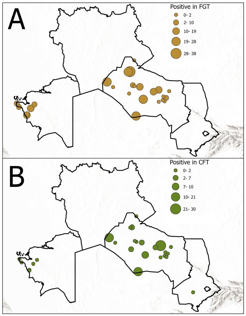 Figure 2. Seroprevalence of T. evansi in the surveyed camels by serological test: (A) FGT results and (B) CFT results. The chart illustrates the higher detection rate of FGT compared to CFT. FGT, Formol gel test; CFT, Complement fixation test.