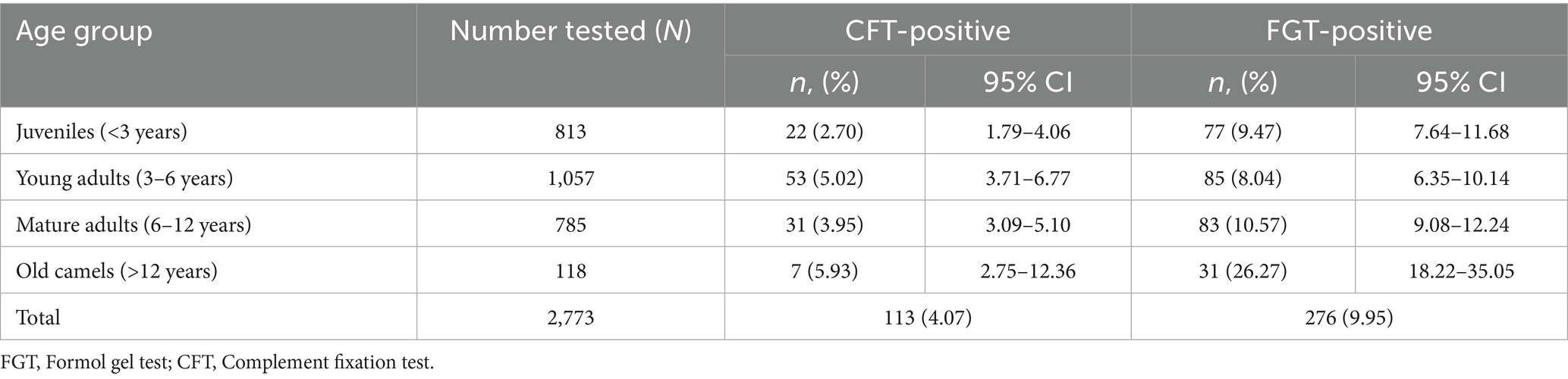 Thus, the FGT detected more than twice as many seropositive camels as the CFT. The seroprevalence results stratified by age group and sex are summarized in Tables 1, 2.