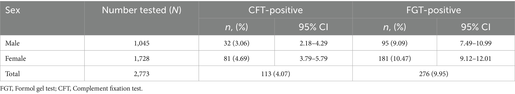 This calculation indicated a minimum requirement of 384 animals. In practice, we collected a total of 2,773 samples, which considerably exceeded this threshold and ensured high precision of prevalence estimates. The narrow 95% confidence intervals around the overall prevalence values (CFT 4.07, 95% CI: 3.36–4.86; FGT 9.95, 95% CI: 8.88–11.13) confirm the adequacy of the realized sample size.