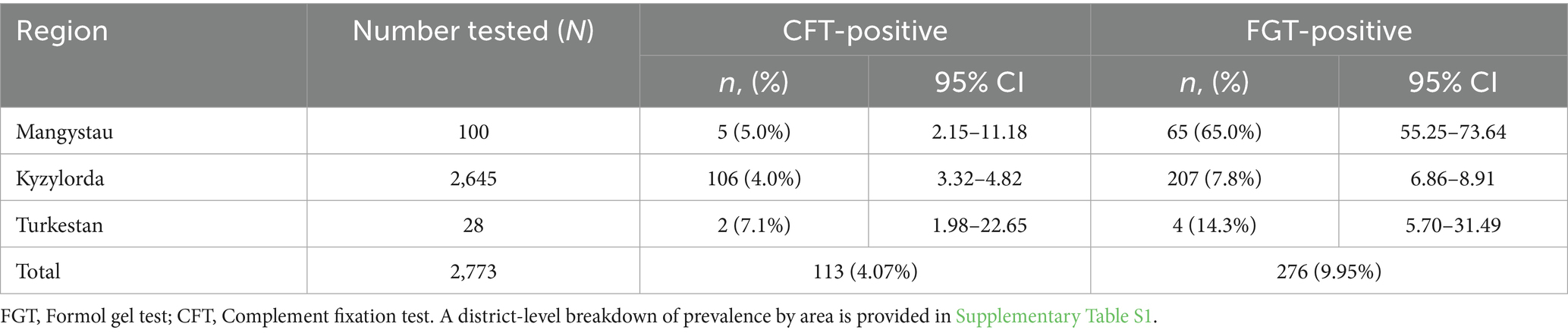 Marked regional heterogeneity was evident, with extremely high prevalence in Mangystau (65% by FGT), moderate levels in Turkestan (14.3%), and relatively low prevalence in Kyzylorda (7.8%). The district-level breakdown (Supplementary Table S1) further highlights this variation. In Kyzylorda, prevalence ranged from as low as 0.55% in Kyzylorda district to as high as 19.1% in Karmakshy. Similarly, in Mangystau, prevalence exceeded 70% in Mangystau and Munaily districts but was only 30% in Tupkaragan. These findings illustrate how local ecological conditions – such as vector density near rivers and pastures – may strongly shape infection risk. Comparable intra-regional variation has been reported in Iran and Pakistan (22).