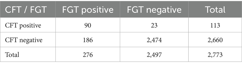Agreement between the two serological assays was further evaluated (Table 4). Overall, 92.4% of samples showed concordant results between CFT and FGT. The Cohen’s kappa statistic was 0.41, indicating moderate agreement. As expected, FGT detected additional positive samples that were negative in CFT, reflecting its higher sensitivity but lower specificity.