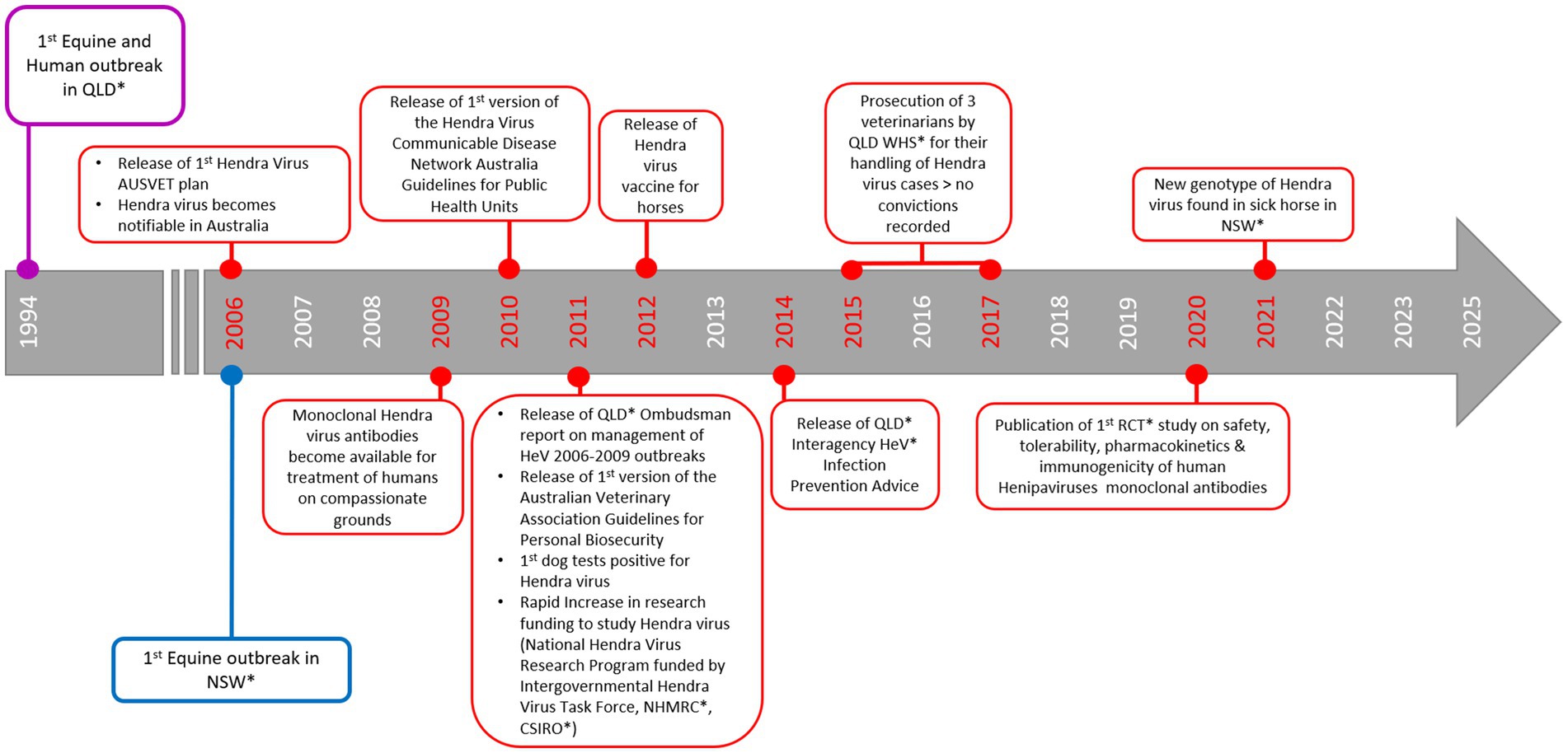 Figure 1. Timeline of Hendra virus outbreaks and key advancements for the management of Hendra virus in Australia. *CSIRO – Commonwealth Scientific and Industrial Research Organisation, HeV – Hendra virus, NHMRC – National Health and medical Research Council, NSW – New South Wales, QLD – Queensland, RCT – Randomised Control Trial, WHS – Workplace Health and Safety (2, 4, 6, 8, 9, 12-14, 18-21, 29).