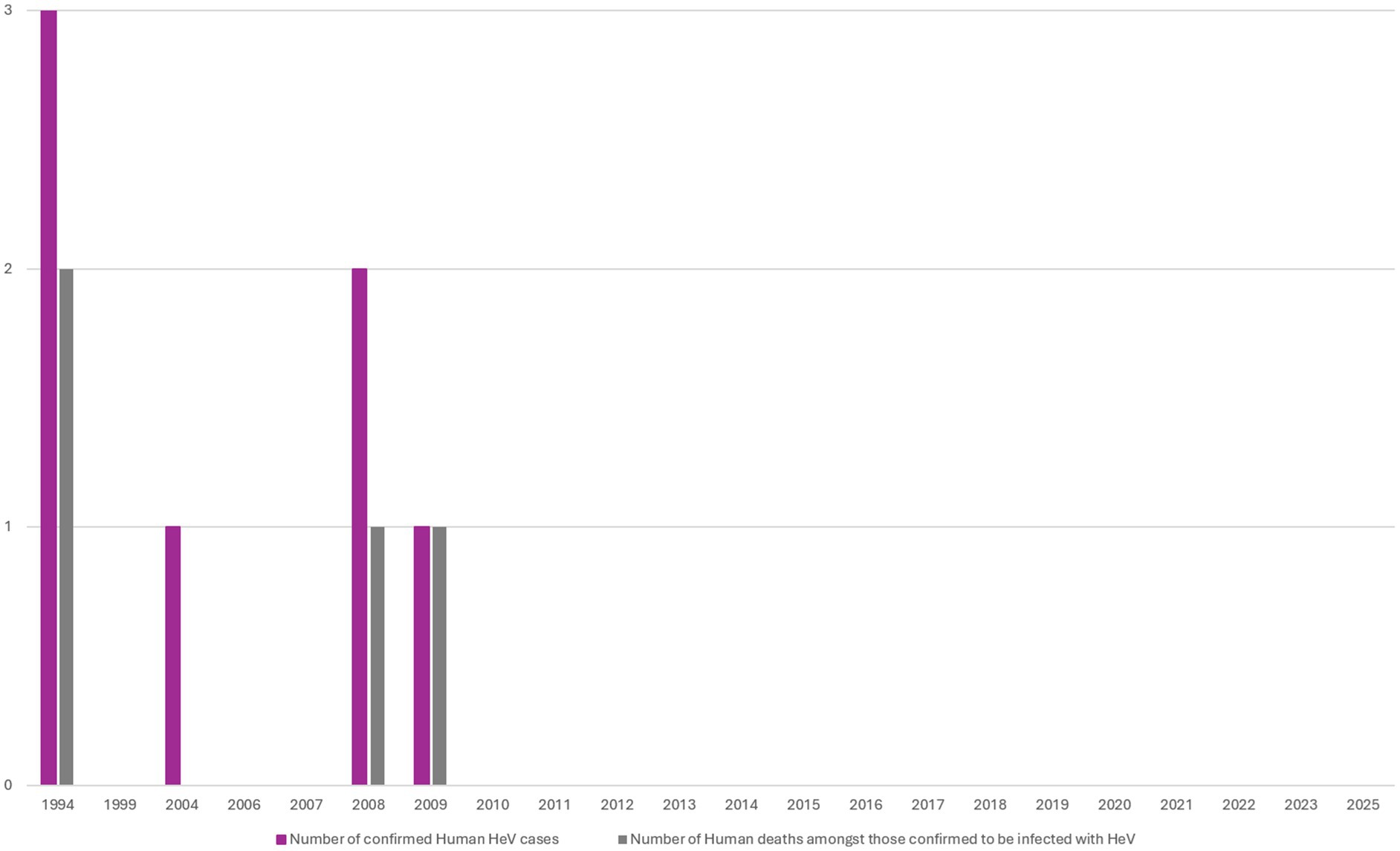 Hendra virus (HeV) was first detected in horses in Australia in 1994 after spill-over infection from flying foxes (Pteropus spp.) (1, 2). There have been over 100 equine and four human deaths associated with HeV spillover in the Australian states of Queensland (QLD) and New South Wales (NSW) (3–8) (Figures 1, 2). HeV is a notifiable disease, being considered a Biosecurity Category Level 1 infection and “Emergency Animal Disease (EAD)” (5). Clinical diagnosis of HeV infection in horses remains challenging as signs in infected horses are non-specific, including colic (abdominal pain) and respiratory and/or neurological symptoms (5). Animals with signs of HeV infection frequently die or are euthanised for welfare reasons (9) and strict burial protocols are required (9, 10). While veterinarians and government authorities were initially unprepared to manage HeV (11–13), extensive infection prevention and control guidelines (IPC) were subsequently developed and promoted to safely manage horses and prevent human exposure (11, 12, 14, 15). The figures below show the number of confirmed equine cases (see Figure 1), human cases (see Figure 2), as well as the timeline of HeV emergence in equine and human populations, alongside key developments in HeV management in Australia (Figure 3). One Health recognises interdependencies between human, animal, and environmental health and calls for coordinated action across these sectors (16). In the specific context of HeV, the human–horse bond, veterinary decision-making, biosecurity policy, wildlife ecology, and public communication intersect. In July 2025, a further death of an unvaccinated horse in QLD (4) underscored the continuing need for a coordinated One Health stance across vaccination uptake, rapid joint assessments, and clear public messaging to markedly reduce risk to people and horses.