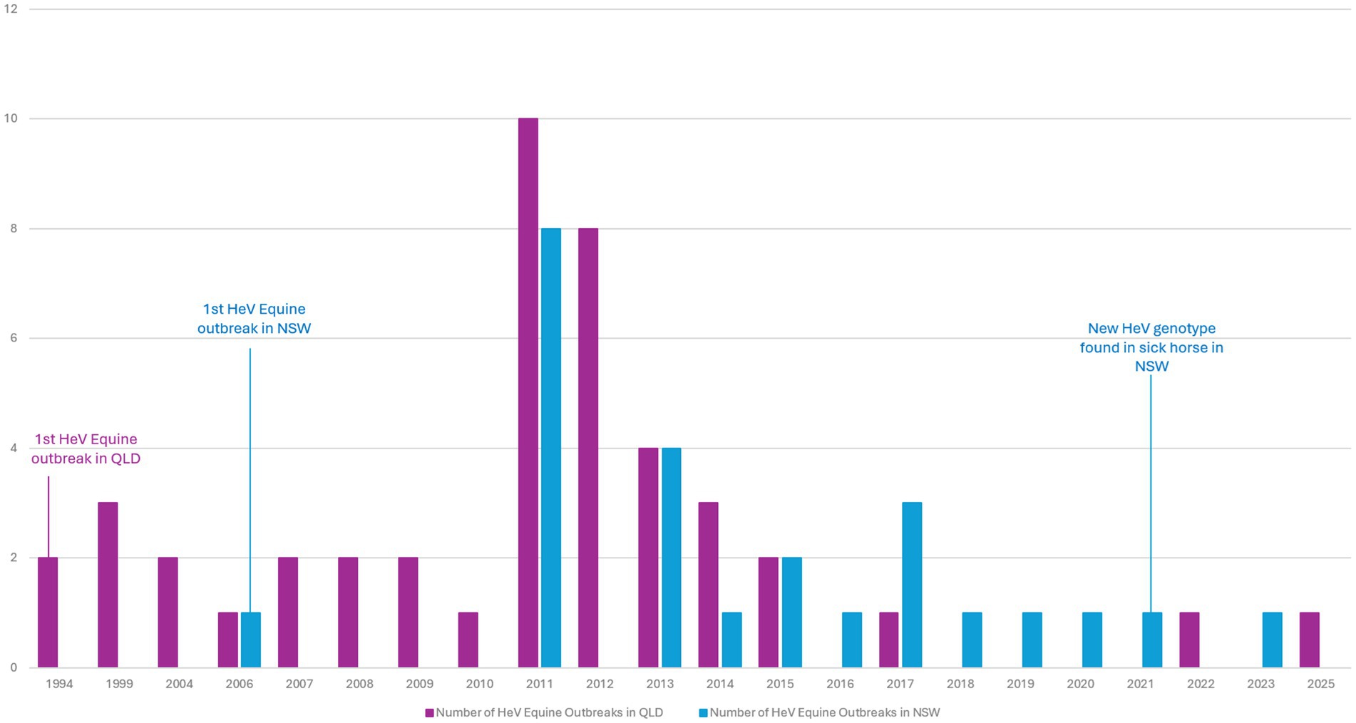 Figure 3. Number of Equine Hendra virus (HeV) Outbreaks per year in Queensland (QLD) and New South Wales (NSW) between 1994 and 2025 (6).
