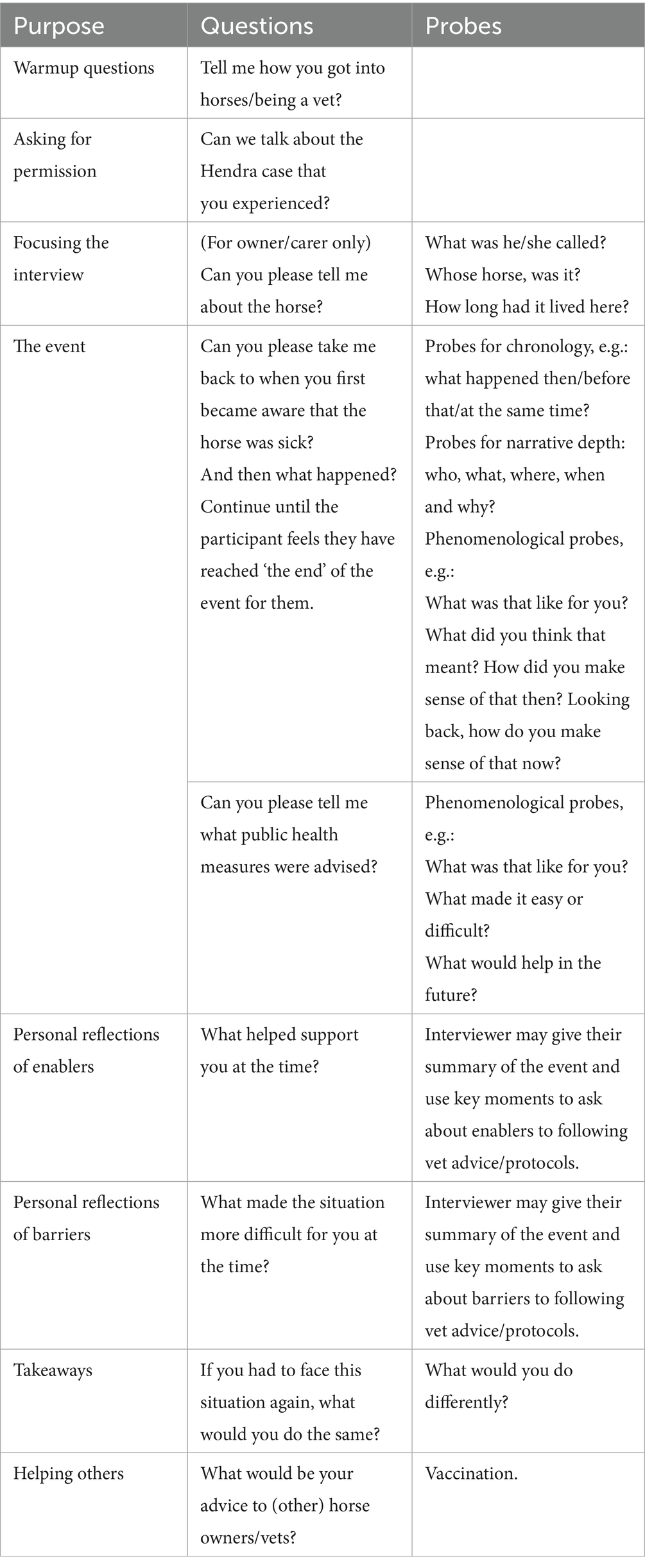 Four semi-structured interviews with owners were conducted face-to-face on affected properties and four were conducted via video conferencing due to participant preference or relocation to another setting. One veterinarian was interviewed in person and four were interviewed via video conferencing. Basic demographic and background information was elicited at the start of the interview. In line with recommendations by Smith et al. (37) the topic guide (see Table 1) was developed and operationalised flexibly in structure with open ended questions designed to be non-directive and participant-led. This enabled participants to focus on their exposure experience, voice any concerns of their choosing, and share lived experiences in the context of biosecurity risks. There was no financial recompense for participation in the study.