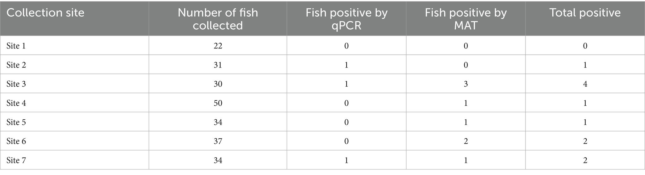 In total, 11 fish (11/238; 4.62%; 95% CI: 2.33–8.12) had either leptospiral DNA present in their kidneys or serum antibodies reactive to at least one leptospiral serovar tested. Six of the seven collection sites (Figure 1) had at least one fish positive for the presence of leptospiral antibodies or leptospiral DNA. The highest number of fish testing positive for leptospiral DNA or antibodies was observed at Site 3 (n = 4), followed by Sites 6 and 7 (n = 2) and Sites 2, 4, 5 (n = 1). No fish collected from Site 1 tested positive for either test (Table 1).