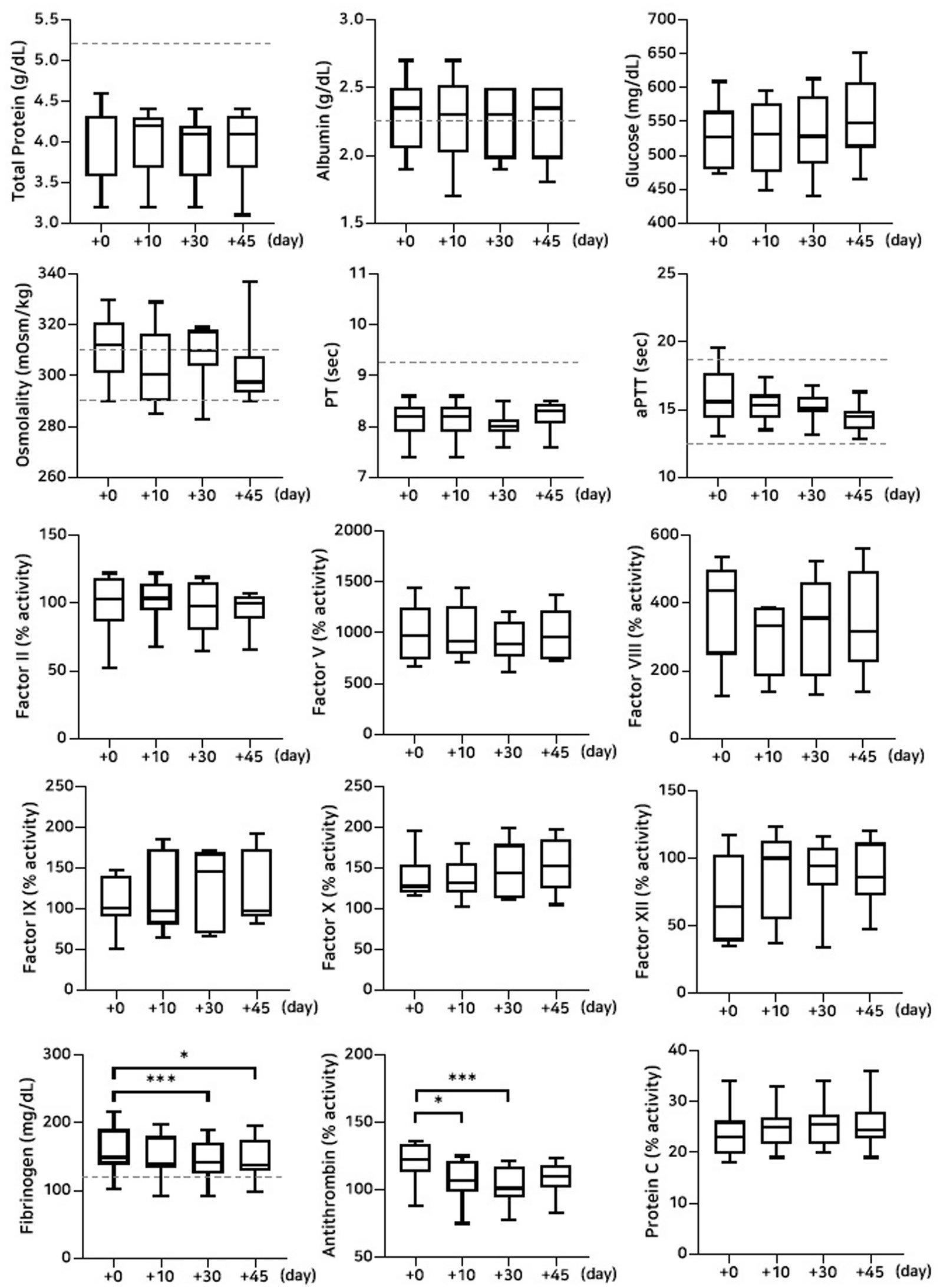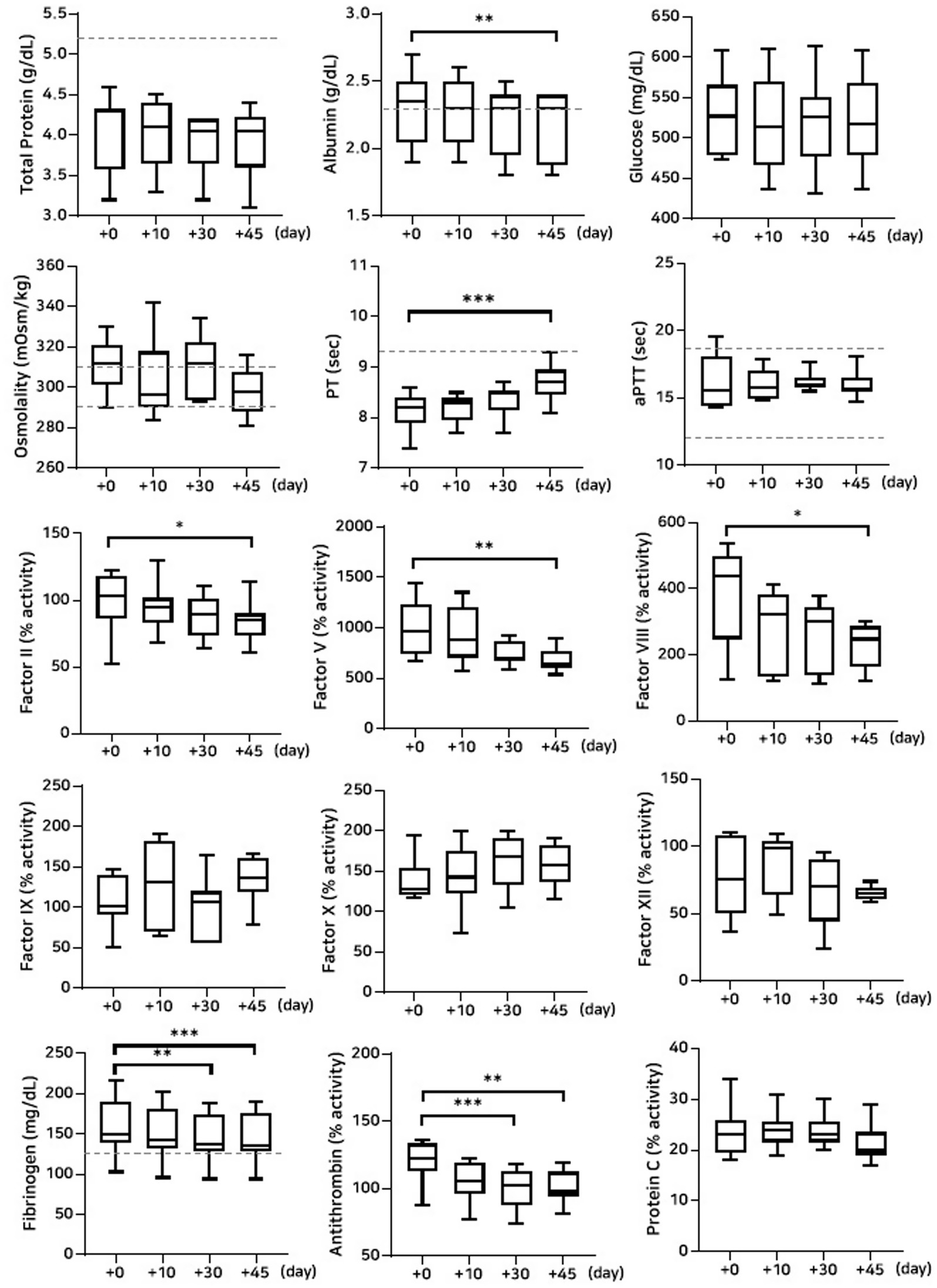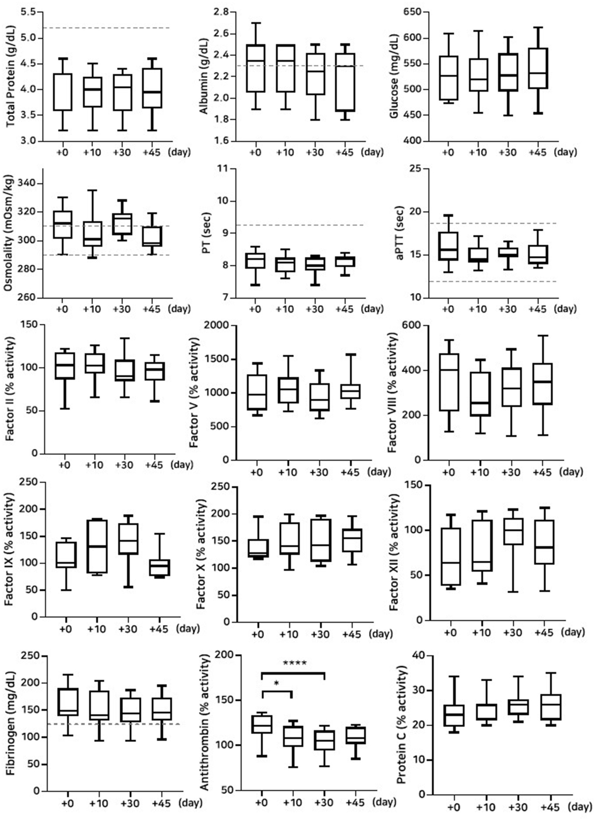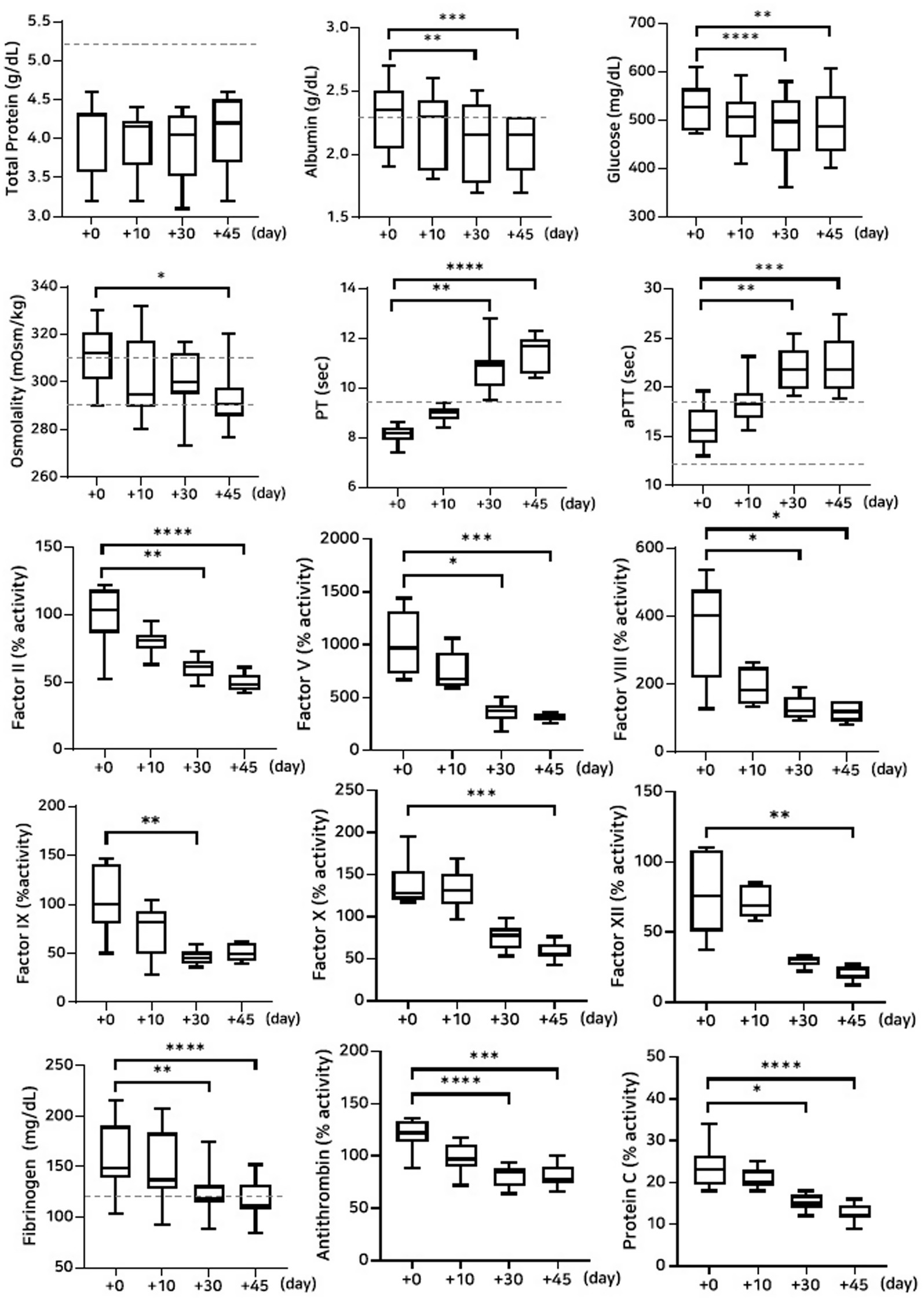 Figure 2. Analysis of changes in plasma composition over 45 days of storage at −80 °C (n = 10 samples per time point). Friedman test analysis of biochemical and coagulation parameters over 45 days of storage at −80 °C. The dotted lines represent the upper reference limit for PT, the upper and lower reference limits for osmolality and aPTT, and the lower reference limits for total protein, albumin, and fibrinogen concentrations. *p < 0.05, **p < 0.01, ***p < 0.001, and ****p < 0.0001.