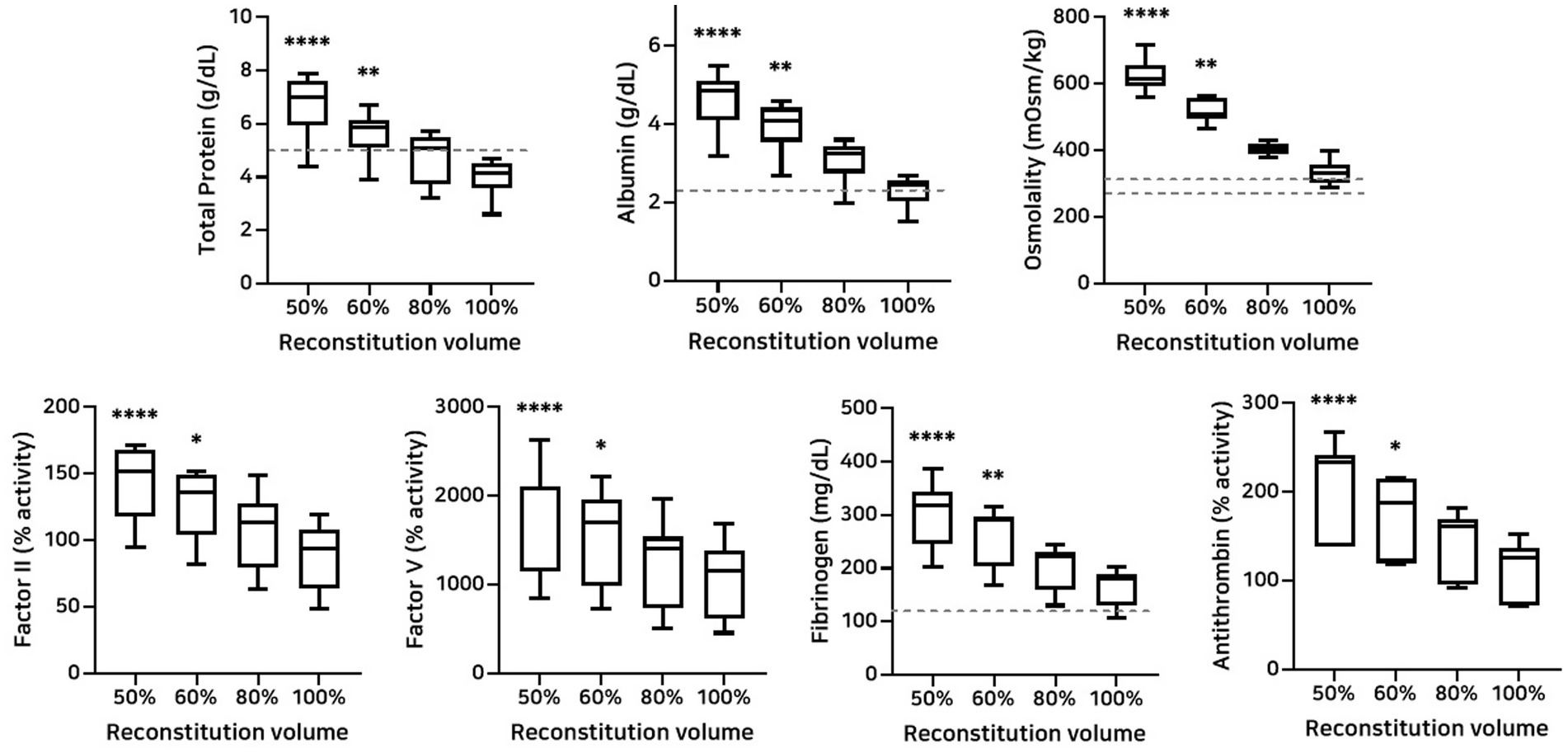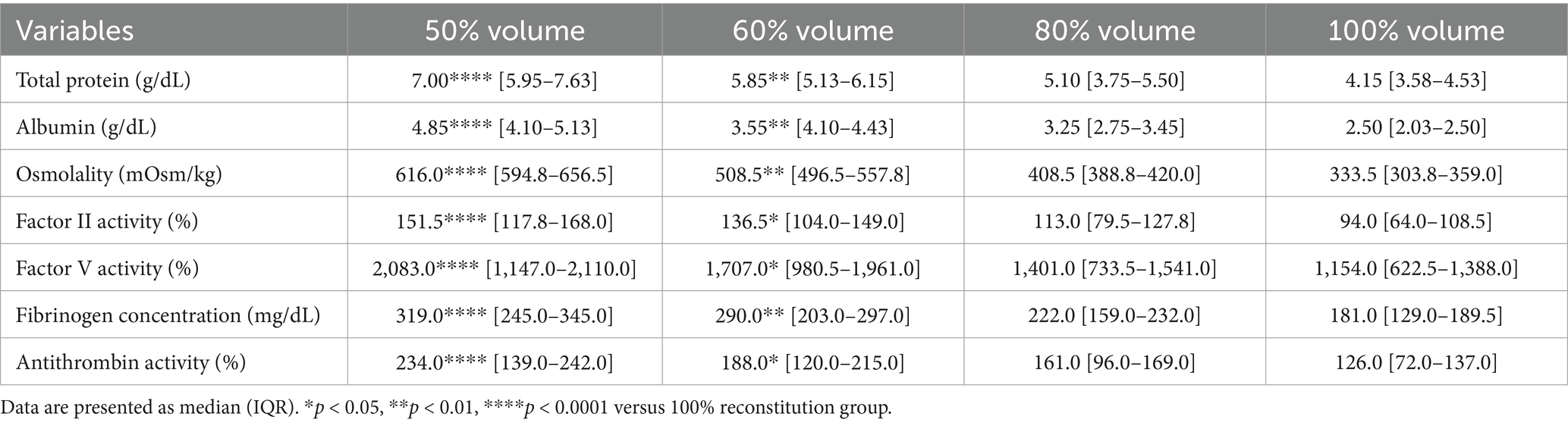 Figure 6. Analysis of changes in plasma composition according to reconstitution volume (n = 10 samples per time point). Friedman test analysis of plasma parameters according to reconstitution volume. Data are presented as median (IQR). The dotted lines represent the upper and lower reference limits for osmolality, and the lower reference limits for total protein, albumin, and fibrinogen concentrations. The 50 and 60% reconstitution groups exhibited statistically significant increases in all measured parameters compared to the 100% reconstitution group. *p < 0.05, **p < 0.01, ***p < 0.001, and ****p < 0.0001 versus 100% reconstitution group.