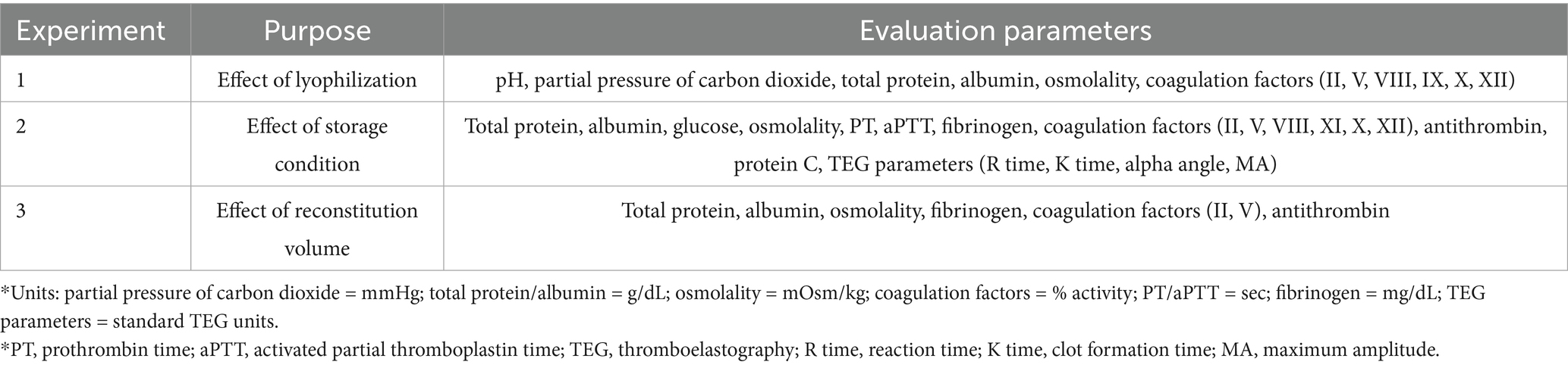 Methods: Ten canine plasma units were lyophilized and stored at −80 °C, 4 °C, room temperature, and 38 °C for 45 days. The plasma compositions before and after lyophilization were compared to assess the impact of the lyophilization. The following parameters were assessed to evaluate storage stability: blood gas analysis, biochemical parameters, coagulation profiles [prothrombin time (PT); activated partial thromboplastin time (aPTT); fibrinogen concentration; the activities of coagulation factors II, V, VIII, IX, X, and XII, as well as those of antithrombin (AT); and protein C], and kaolin-activated thromboelastography. Aerobic bacterial cultures were performed using thioglycollate broth to assess sterility. Lyophilized plasma samples were reconstituted to 50, 60, 80, and 100% of the original plasma volume to assess the effects of different reconstitution volumes on plasma components. Total protein, albumin, osmolality, selected coagulation factors (II and V), fibrinogen, and AT were measured and compared across the reconstituted groups.