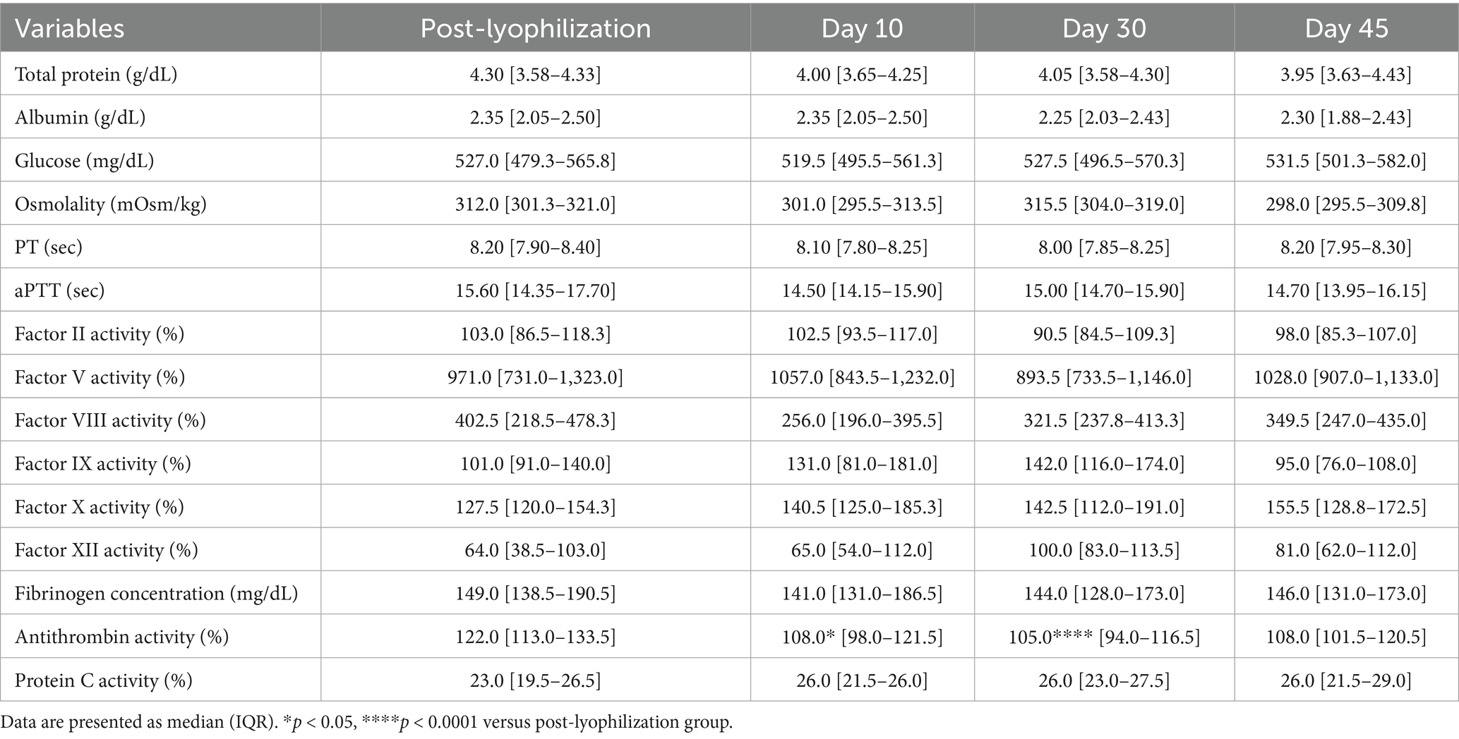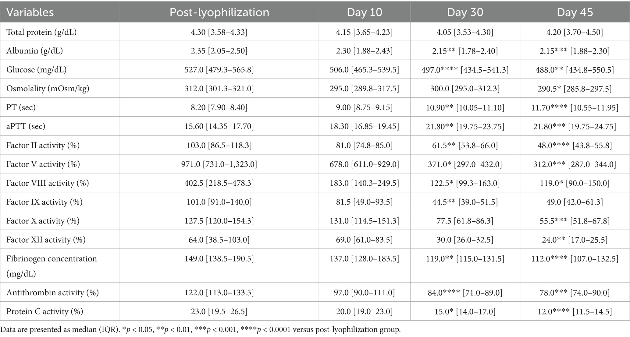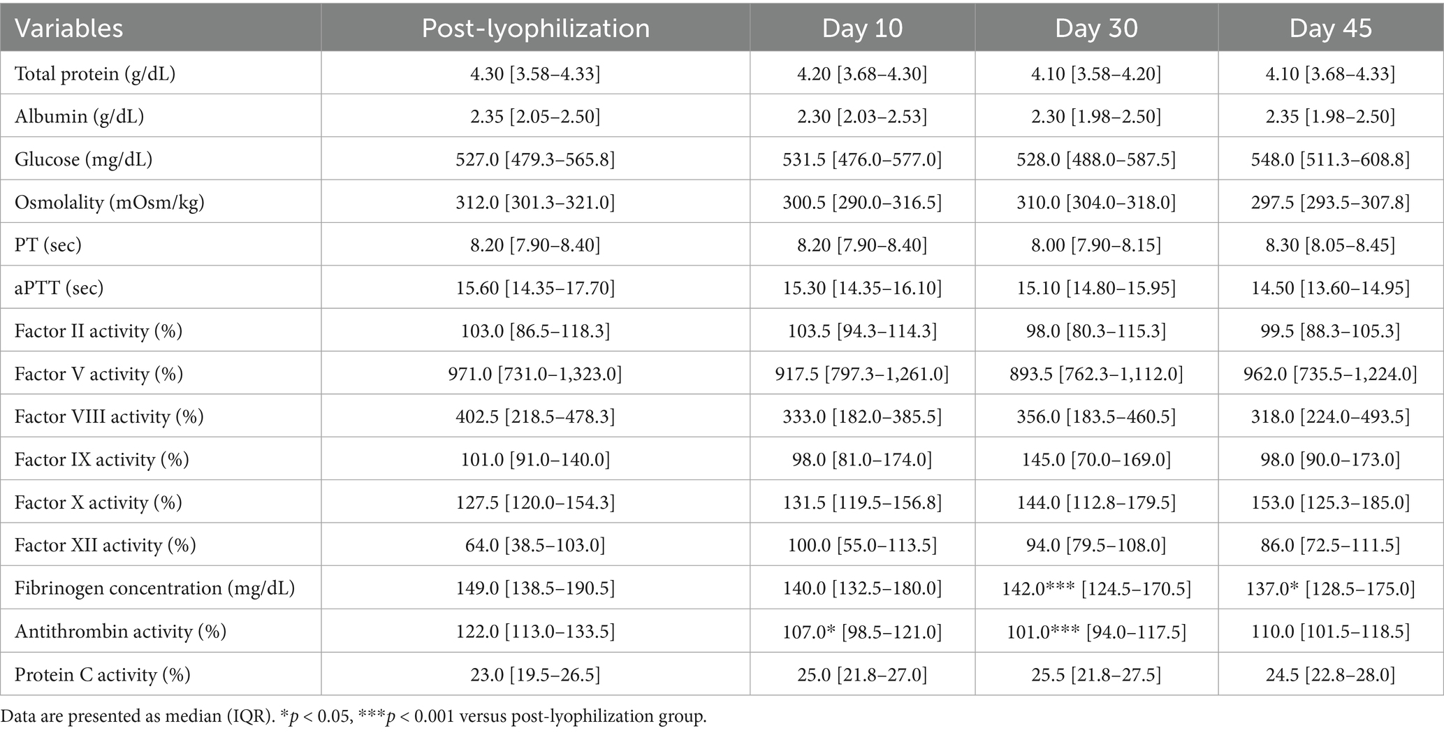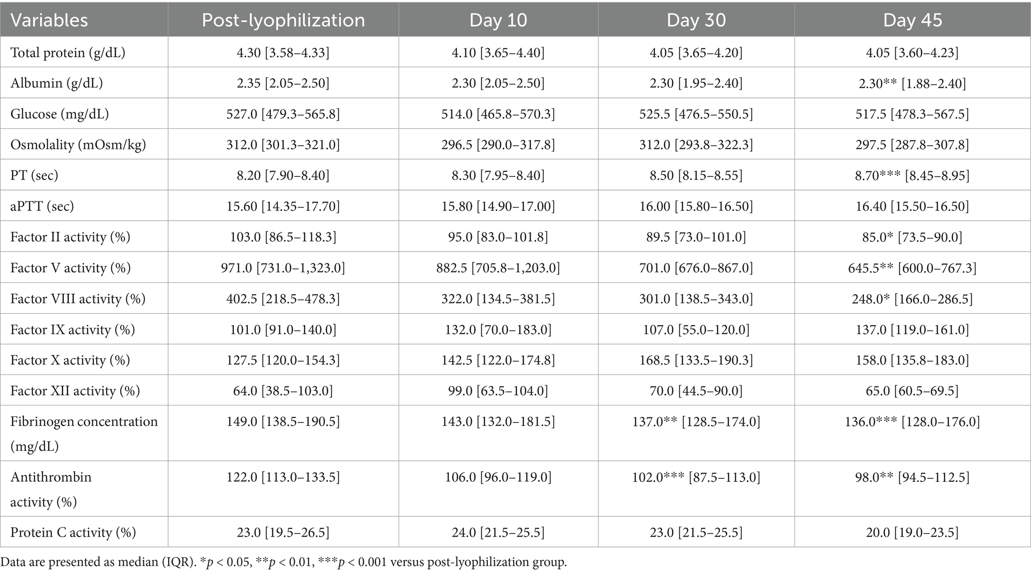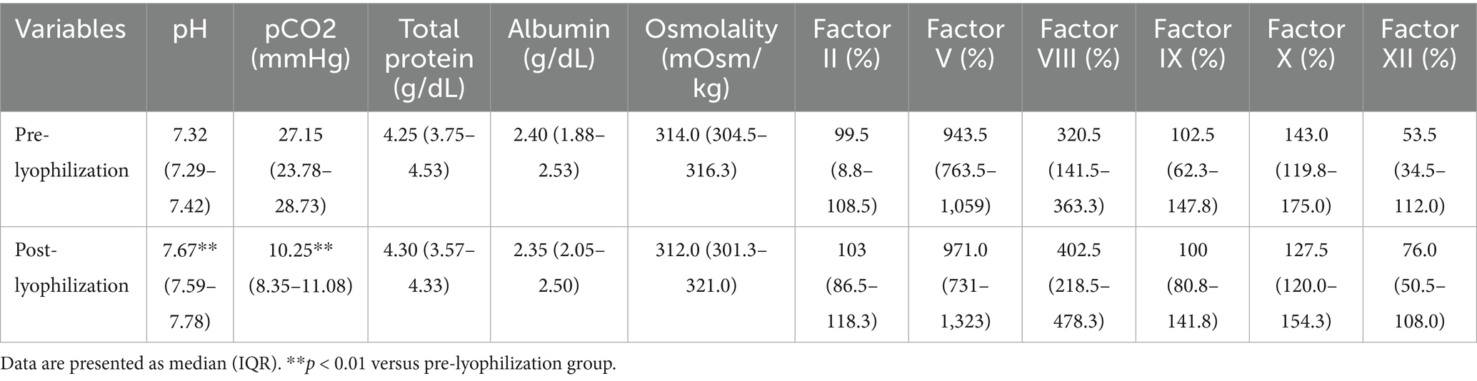 The pH significantly increased after lyophilization (p = 0.02), which was attributed to a marked reduction in the partial pressure of carbon dioxide (p = 0.002), as shown in Table 2. In contrast, no significant changes were observed in total protein, albumin, glucose, osmolality, or the activities of coagulation factors II, V, VIII, IX, X, and XII.