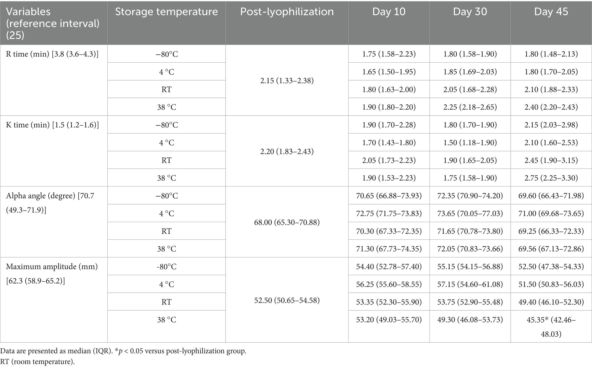 Table 5. Analysis of changes in thromboelastography parameters under different storage temperature conditions.