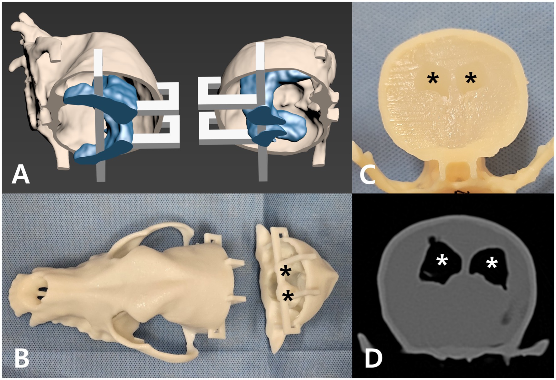 Figure 1. Development of the cranio-ventricular model (CVM). (A) 3D-reconstructed dog skull (beige) and ventricular system (blue) with a detachable section (white supports) for later agar filling. (B) The skull and ventricle models 3D-printed in resin. Black asterisks mark the lateral ventricles in the caudal skull. (C) Agar gel filling the cranial vault after removal of the ventricle mold. Black asterisks mark the hollow lateral ventricle spaces. (D) Transverse CT image of the completed CVM, with white asterisks indicating the lateral ventricles.